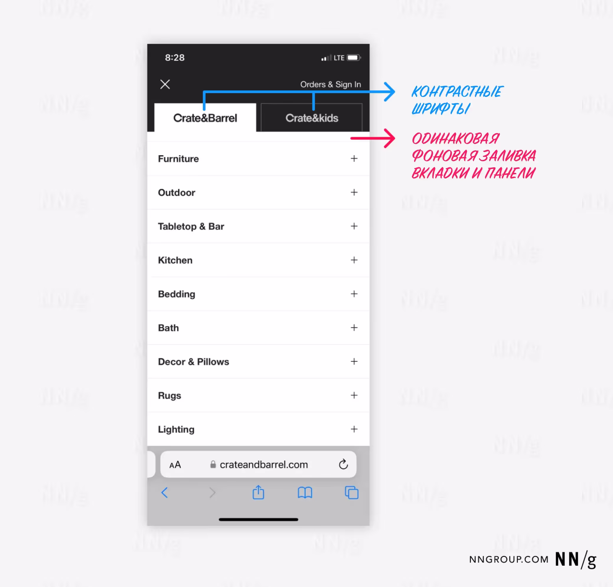 Как внутристраничные, так и навигационные вкладки должны быть согласованными (согласованность — это эвристика юзабилити; она создает у пользователя ощущение контроля). Мы должны использовать одинаковое оформление для всех выбранных и невыбранных вкладок внутри списка. При этом важно разграничить разные типы вкладок, чтобы показать пользователям, что они ведут себя по-разному.