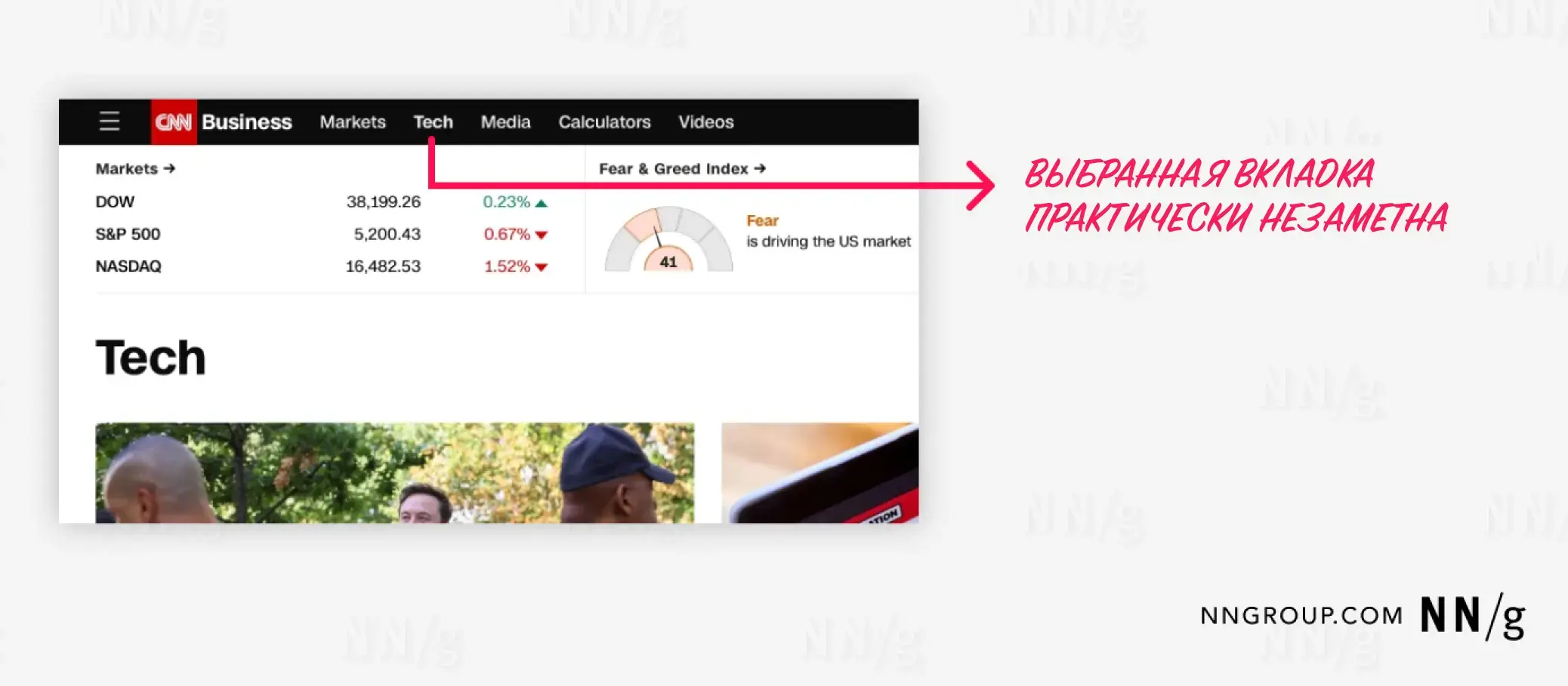 - Навигационные вкладки помогают перемещаться между разными страницами. При этом местоположение пользователя в иерархии сайта должно быть четко обозначено визуальным индикатором.