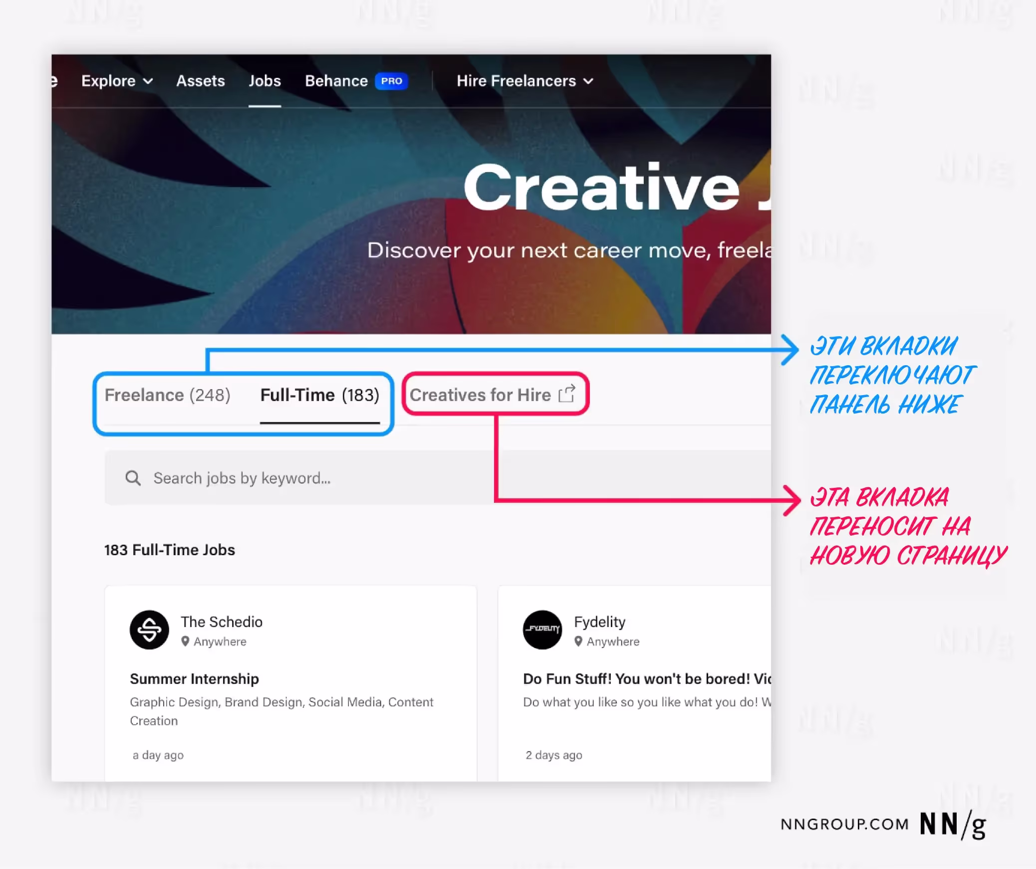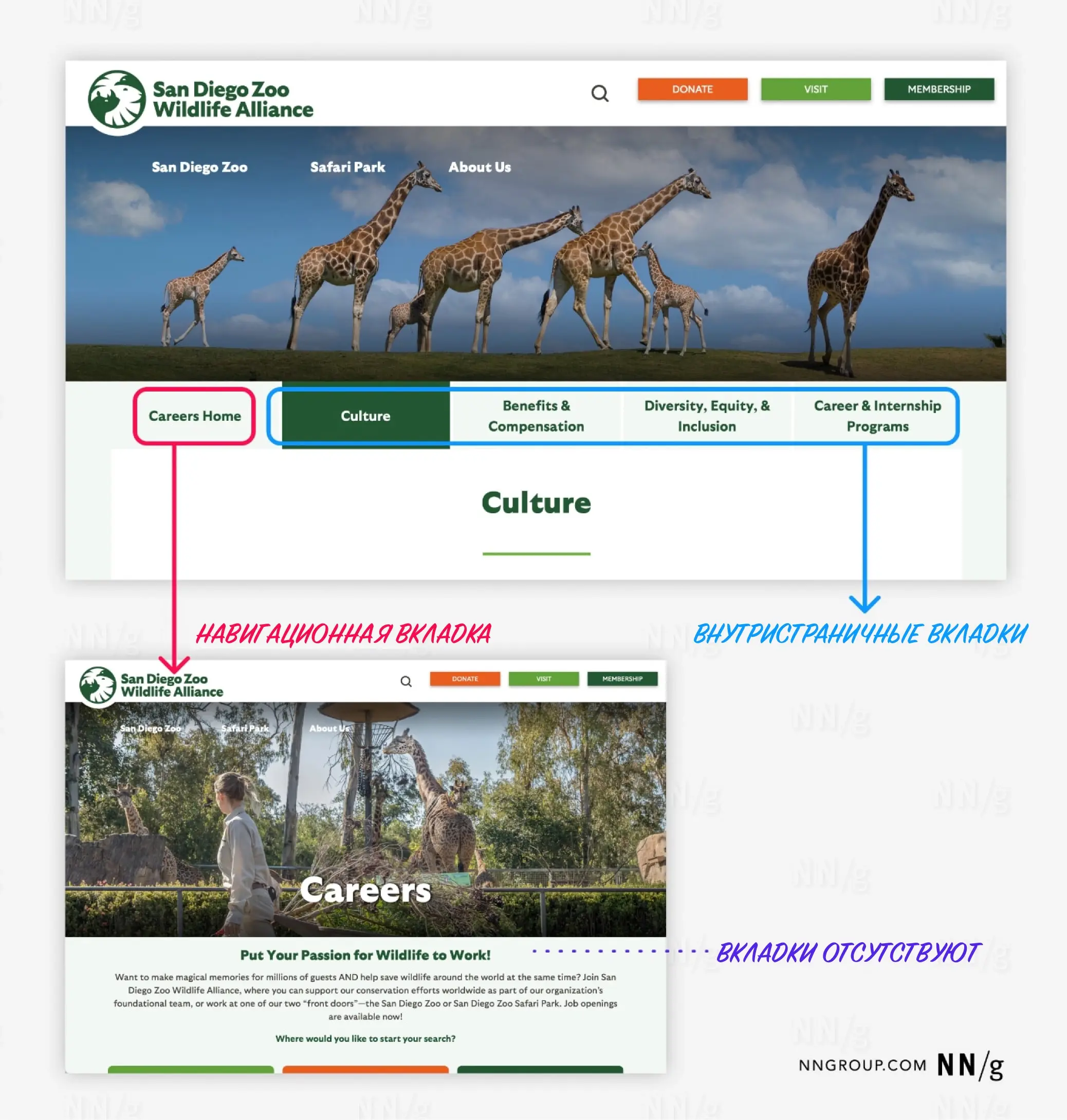 Когда внутристраничные и навигационные вкладки располагаются в одном списке, они сбивают пользователей с толку. Внутристраничные вкладки должны содержать схожие материалы и отображать их на той же странице. Навигационные же вкладки должны содержать разный контент и переносить пользователей на другие страницы.