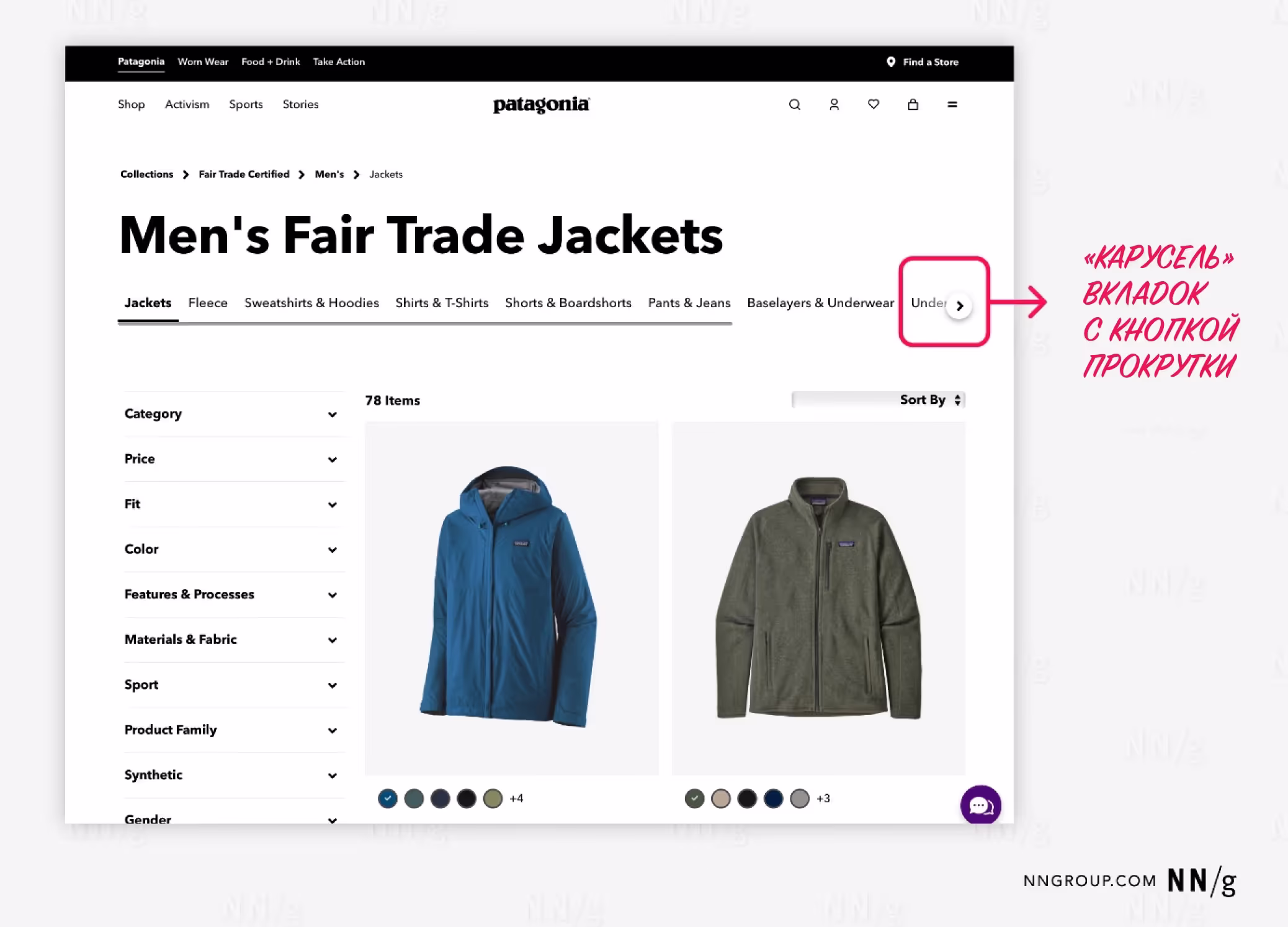 Patagonia: Когда вкладки выходят за пределы области просмотра, на экране появляется кнопка со стрелкой, нажав на которую пользователь может прокрутить список по горизонтали