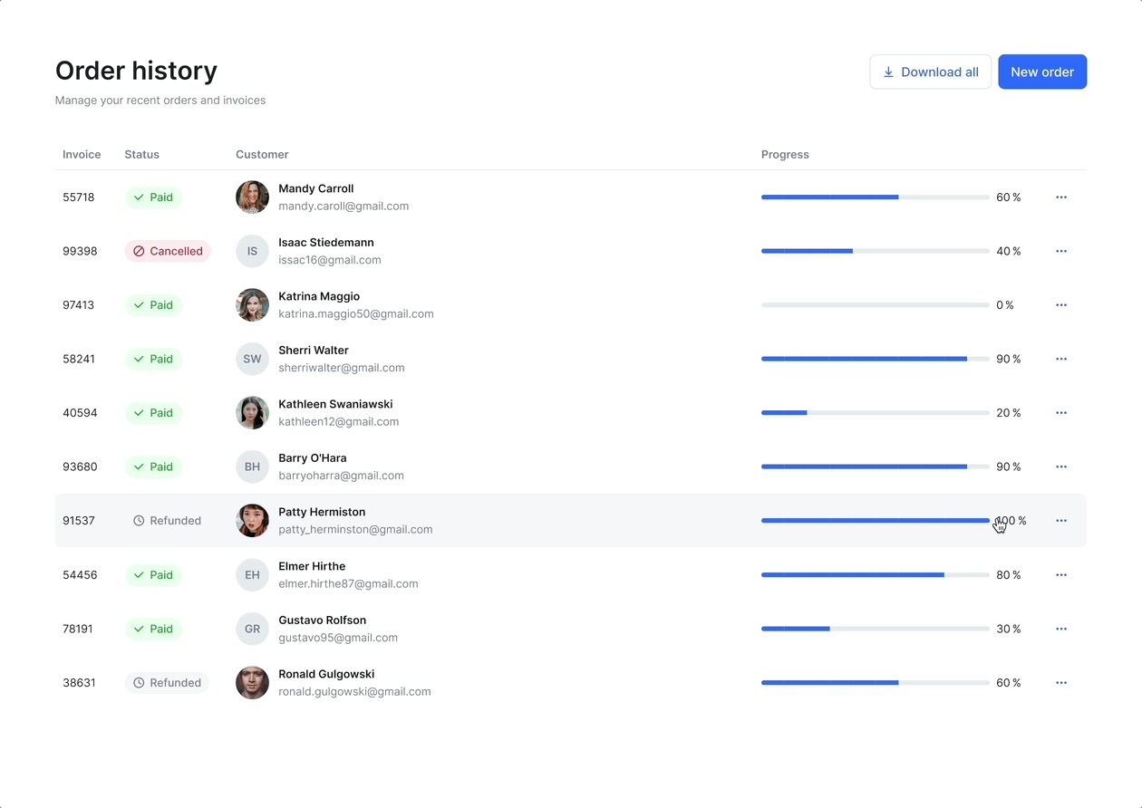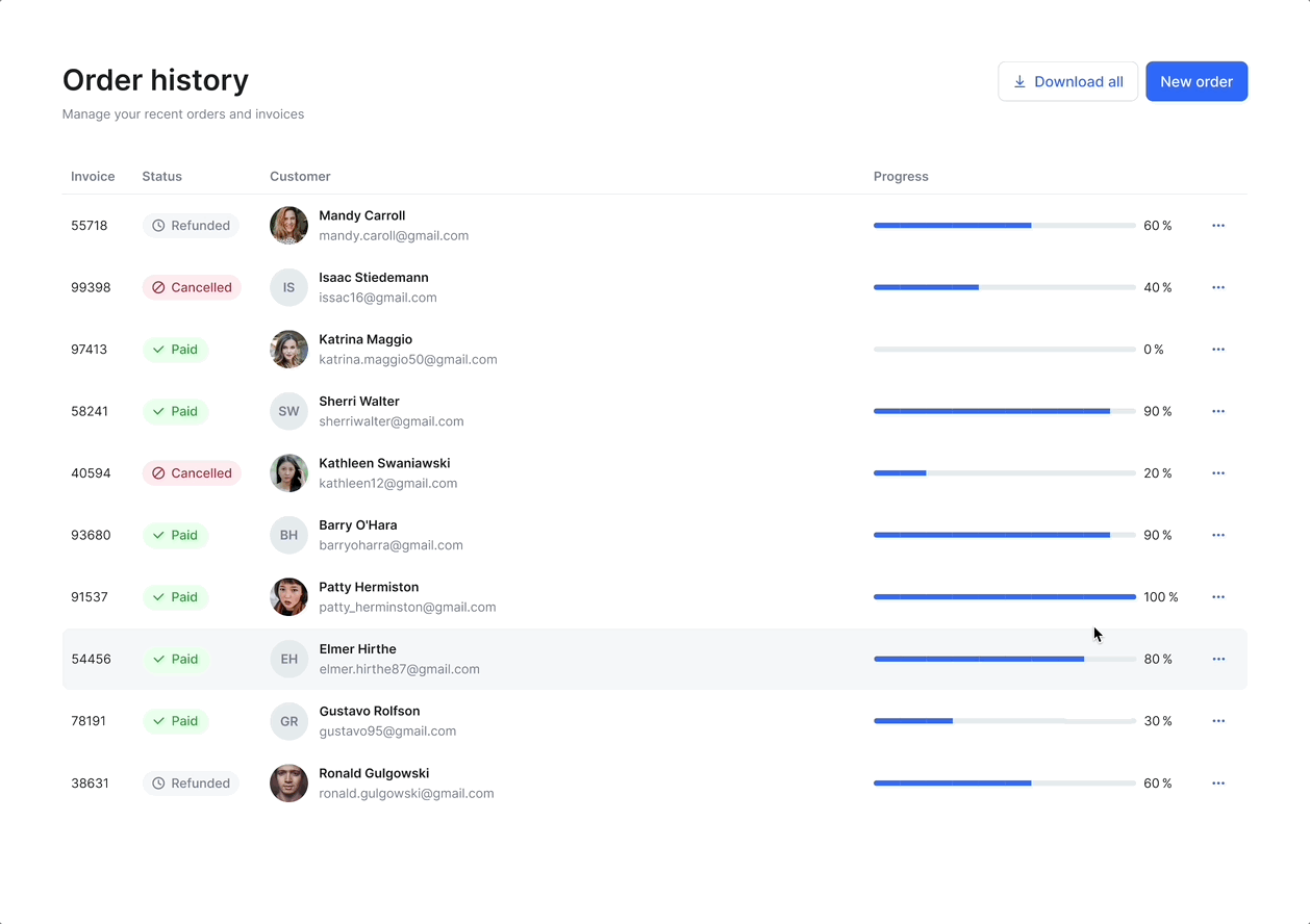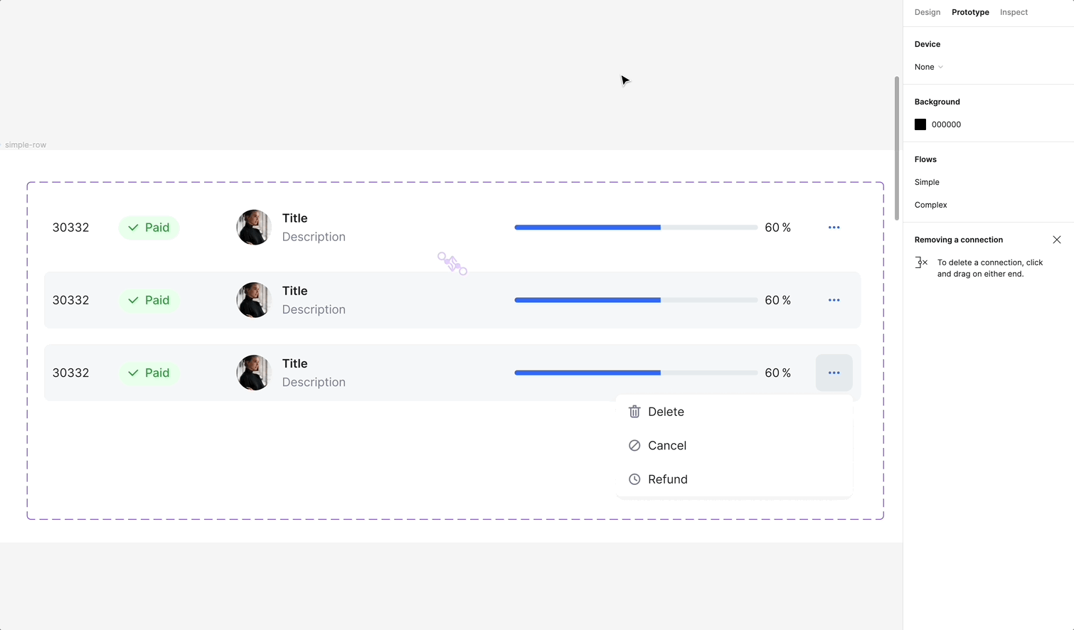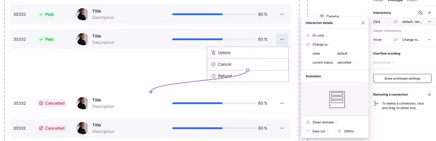 Строка таблицы имеет 3 состояния (по умолчанию, наведение, открытое меню) и 3 статуса (оплачен, отменен, возвращен) = 3*3 = 9 вариантов компонентов.