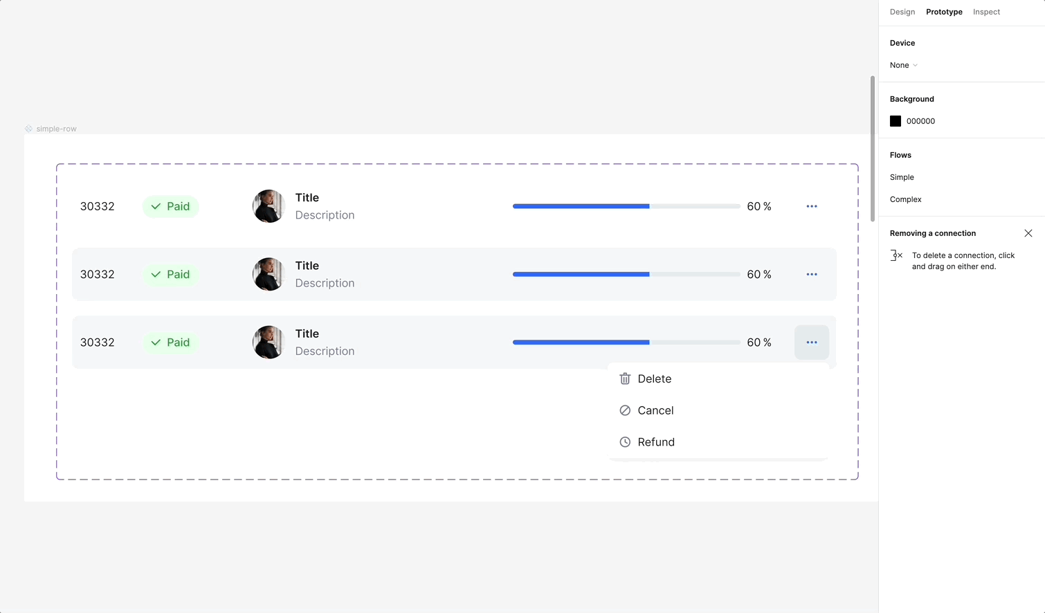 Шаг 3. Подготовьте компонент строки таблицы с вариантами состояний: по умолчанию, наведение и открытое меню. Используйте кнопку выпадающего меню, которую мы создали ранее, при открытом меню она должна быть в активном состоянии.