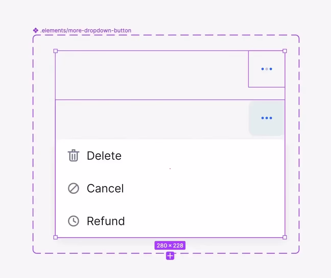 На этот раз я создала базовый компонент из выпадающего меню, кнопки и кнопки выпадающего меню, потому что теперь мы имеем дело с изменением поведения зависимого компонента в контексте использования.