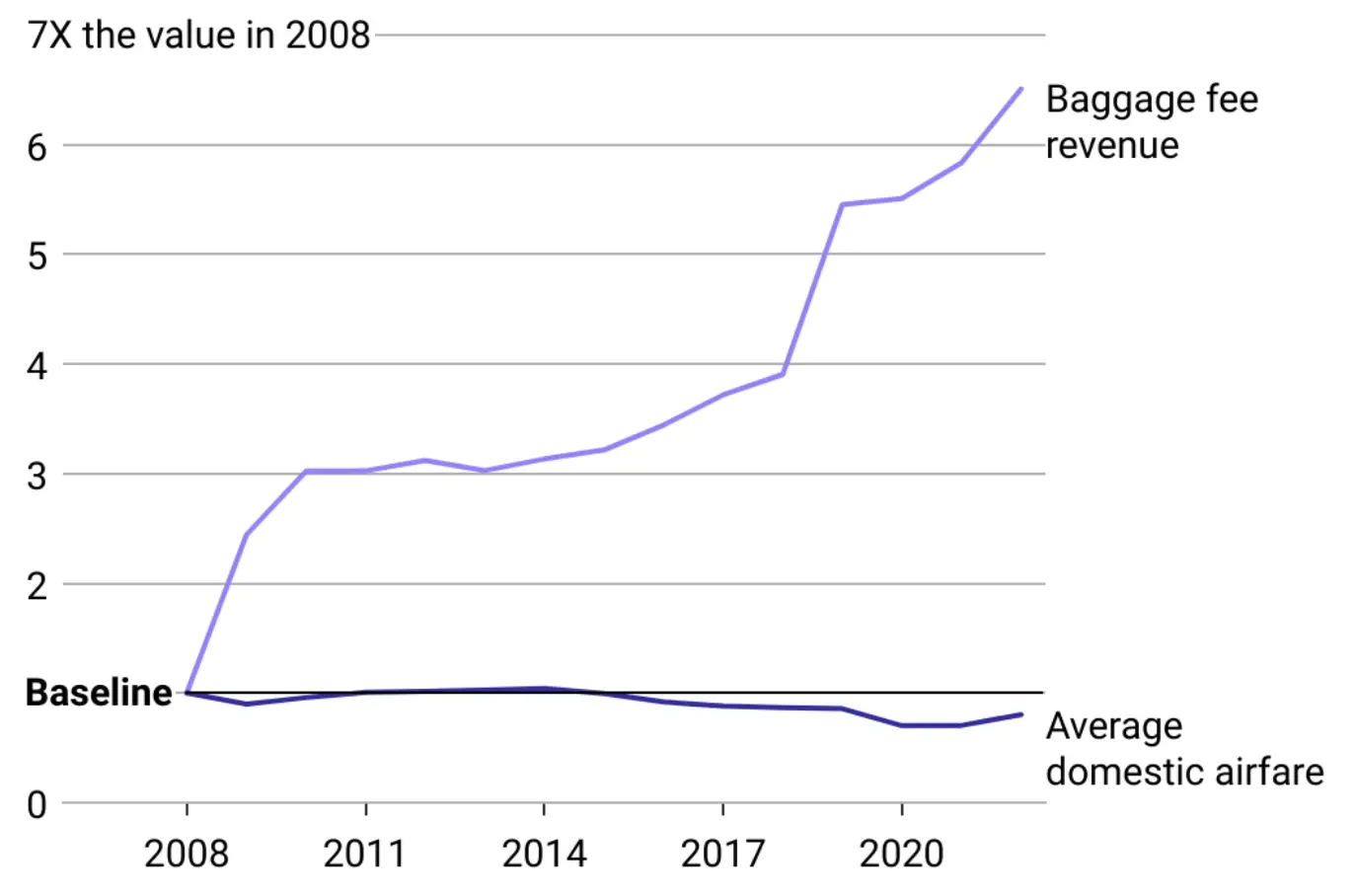 Бюджетные авиакомпании, например, Ryanair и Spirit, теперь получают около 10–20% своих доходов от сборов за багаж и выбор места. Даже крупные авиакомпании, такие как British Airways, Delta и United, получают около 5% своих доходов от этих дополнительных услуг.