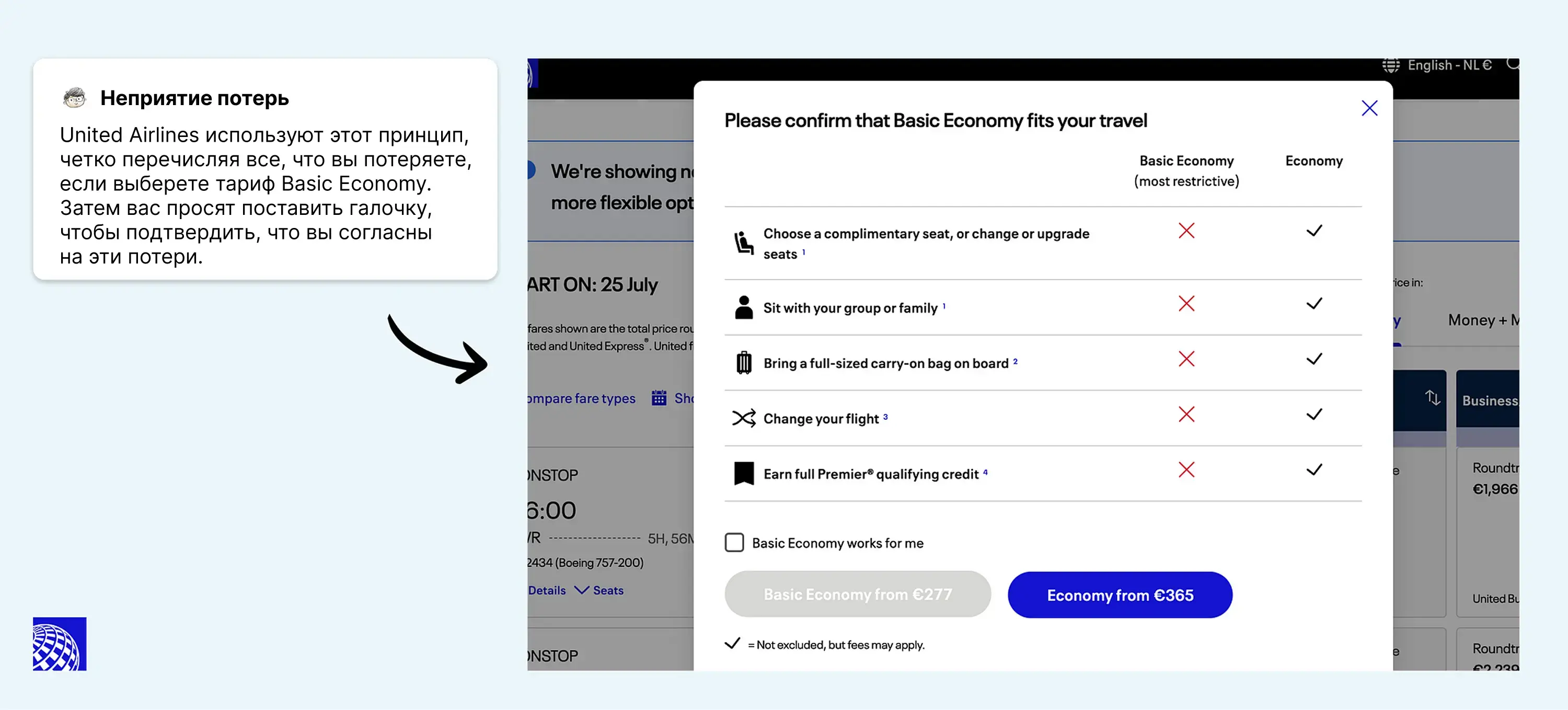 Вернемся к примеру United Airlines. Выбрав Economy вместо Basic Economy, вы получаете: