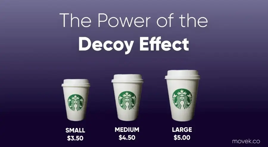 Эффект приманки — это психологический феномен, который возникает, когда третий, самый невыгодный вариант (приманка) побуждает людей выбирать одну из двух оставшихся опций, часто более дорогую.