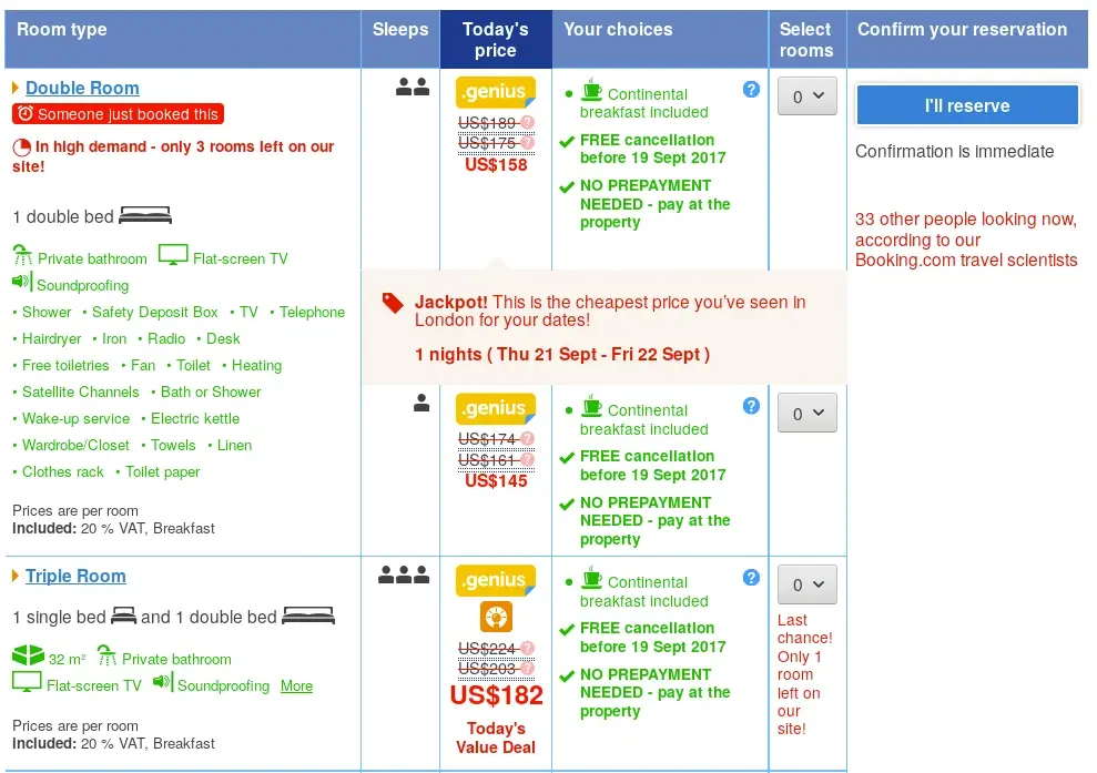 На протяжении многих лет такие сайты, как Booking.com, Expedia и Amazon, пугают пользователей сообщениями типа «Остался 1 номер» или «Последний товар в наличии», чтобы создать ощущение срочности и подтолкнуть людей к совершению покупки.