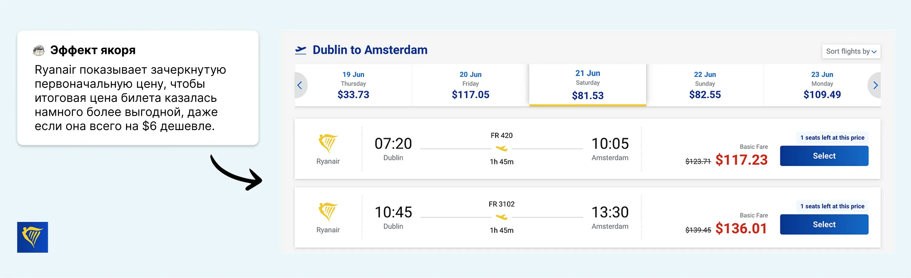 Вот пример с сайта Ryanair, где они зачеркивают исходную цену $123,71 и показывают $117,23. Если вы не будете вникать в цифры, вам может показаться, что вы экономите много денег. Но на самом деле разница составляет всего $6, что едва ли можно назвать реальной скидкой.