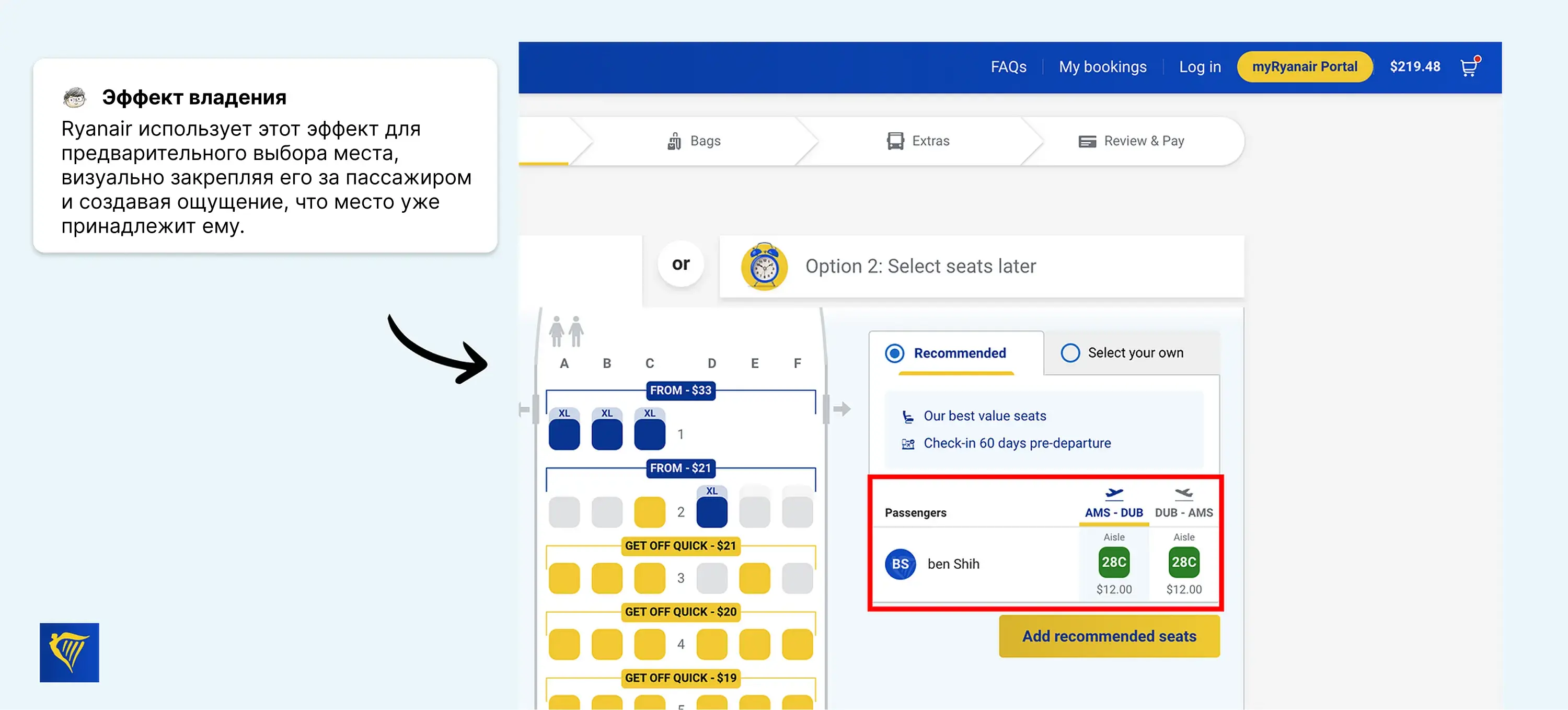 Ryanair (да, опять, простите) использует этот принцип для «предварительного выбора» места во время бронирования, чтобы создать ощущение, что оно уже ваше и вам нужно всего лишь нажать одну кнопку, чтобы сохранить его за собой.