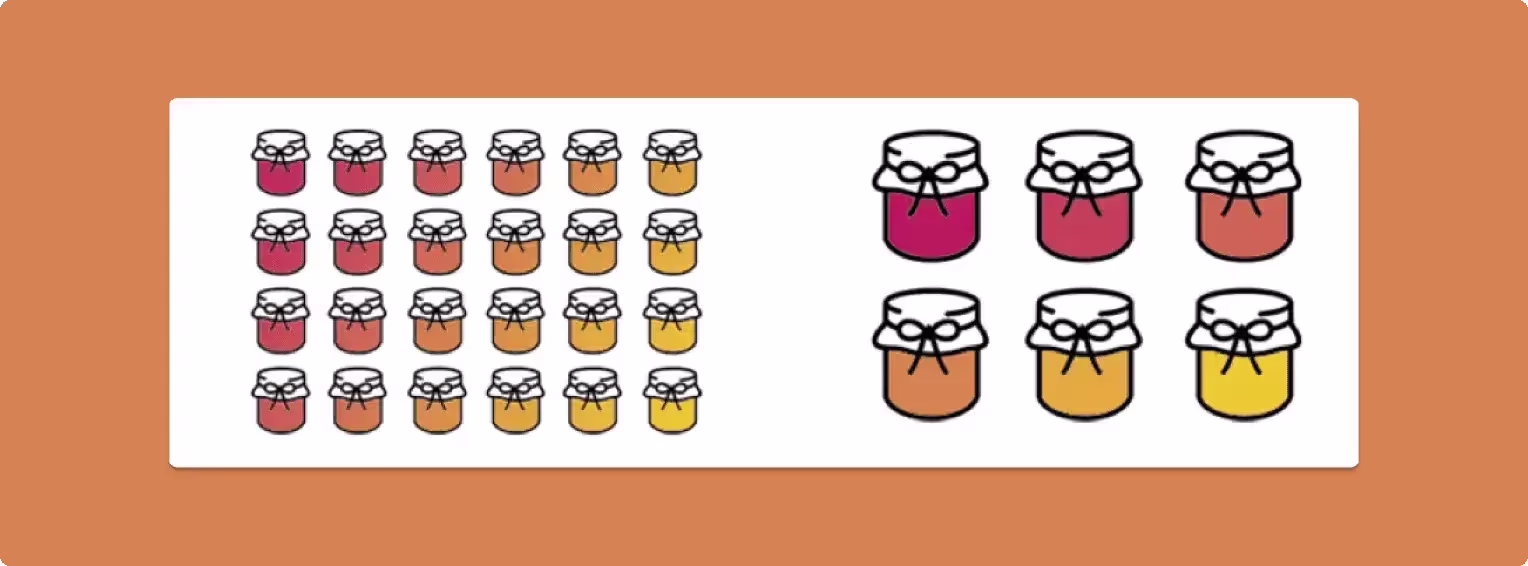 Шина Айенгар, канадская писательница и профессор, в 2000 году провела исследование "Эксперимент с вареньем", чтобы доказать существование парадокса выбора. A/Б-тестирование проходило в 2 этапа: