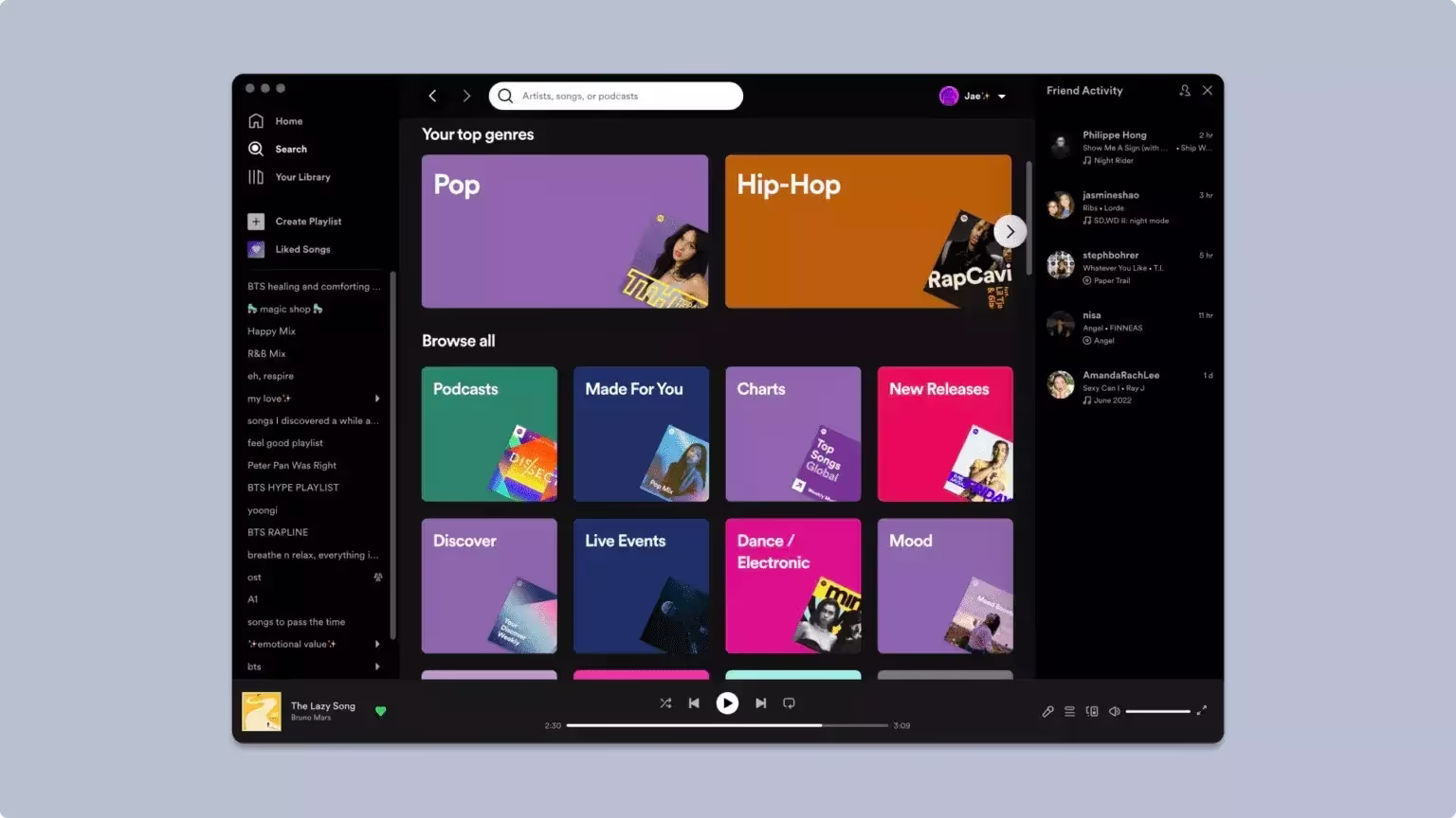 Spotify рекомендует музыкальные жанры, располагая наиболее подходящие опции сверху в карусели по две, а остальные ниже — рядами по четыре. Таким образом, приложение предоставляет пользователю нужную информацию, и он может без труда разобраться в ней. Выбор цветов также упрощает восприятие контента.