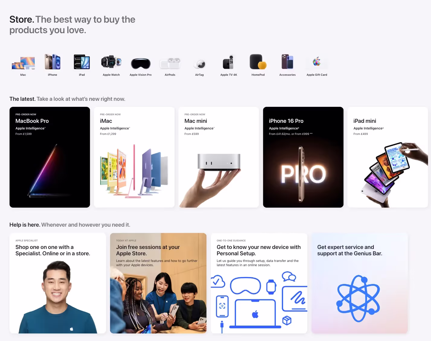 Пример продуманной визуальной иерархии — сайт Apple: изображения продуктов и CTA-кнопки располагаются на видном месте, подталкивая пользователей к совершению покупки.