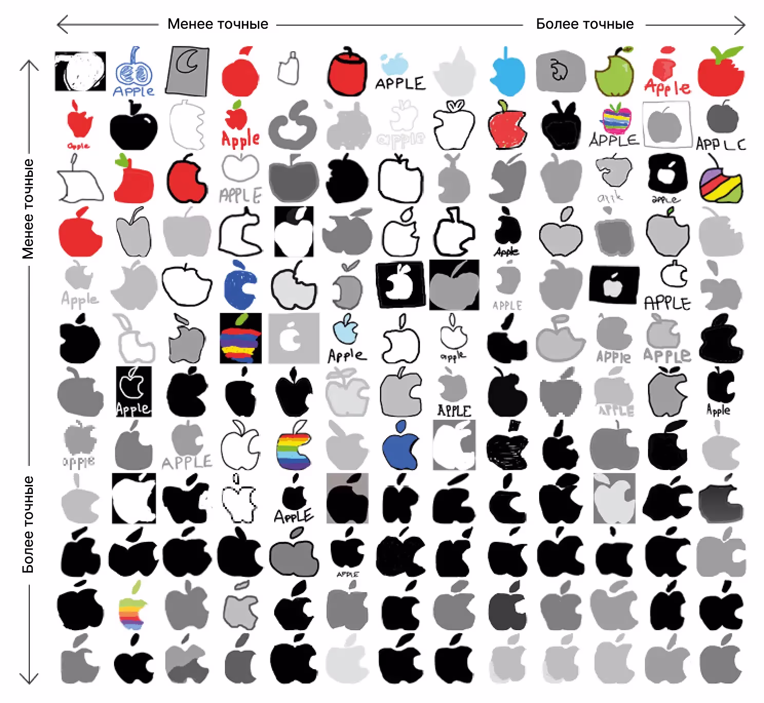 Самой распространенной ошибкой, которую допустила треть участников, было добавление несуществующего стебля. Это подтверждает следующую гипотезу: люди знают, что логотип имеет форму яблока, но при этом они имеют в виду идеализированный образ яблока из своей головы, а не конкретное яблоко в логотипе Apple. 6% участников даже раскрасили лого в красный цвет, что опять же обусловлено их представлениями о том, как должно выглядеть яблоко.