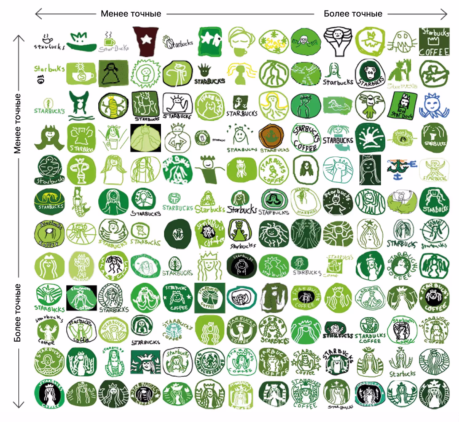 Точно воспроизвести форму знака оказалось сложнее, особенно, когда речь шла о таких детализированных изображениях, как логотип Starbucks. На графике видно, что примерно половина участников нарисовала русалку, но забыла про ее хвост или корону.
