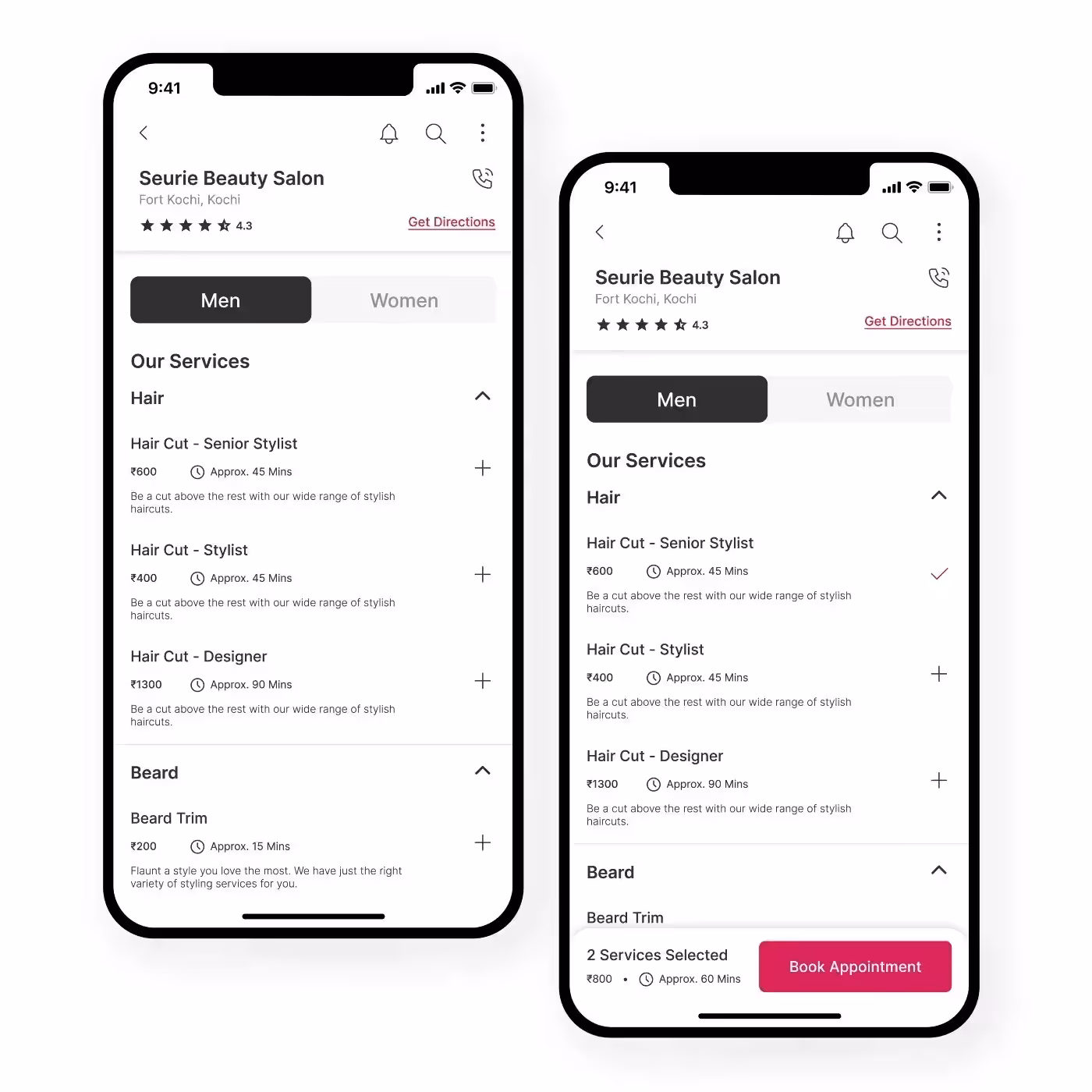 Этот экран включает рейтинг салона, описание и стоимость каждой услуги, а также время, которое потребуется для посещения салона. Все это поможет клиентам найти самый подходящий вариант.