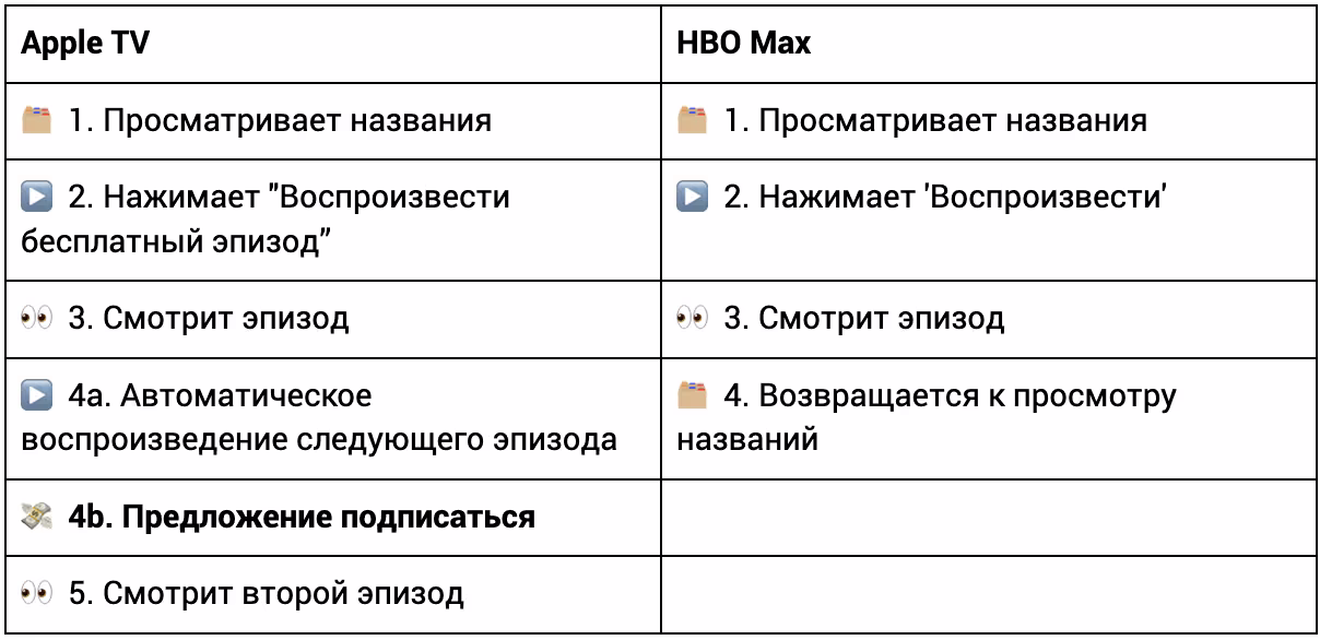 Для ясности: различие заключается в том, что "бесплатный эпизод" Apple TV — это путь (из точки A в точку B, C или D), в то время как у HBO — это обратный шаг (из точки A в точку B, а затем назад в A).