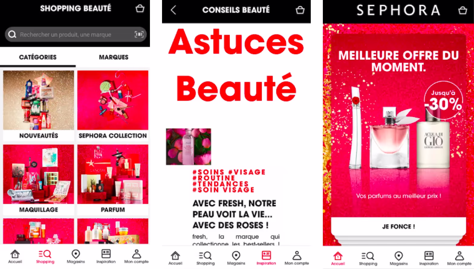 3 изображения ниже — скриншоты из приложения Sephora. Красно-розовый цвет явно доминирует во всем приложении, однако он не является основным.