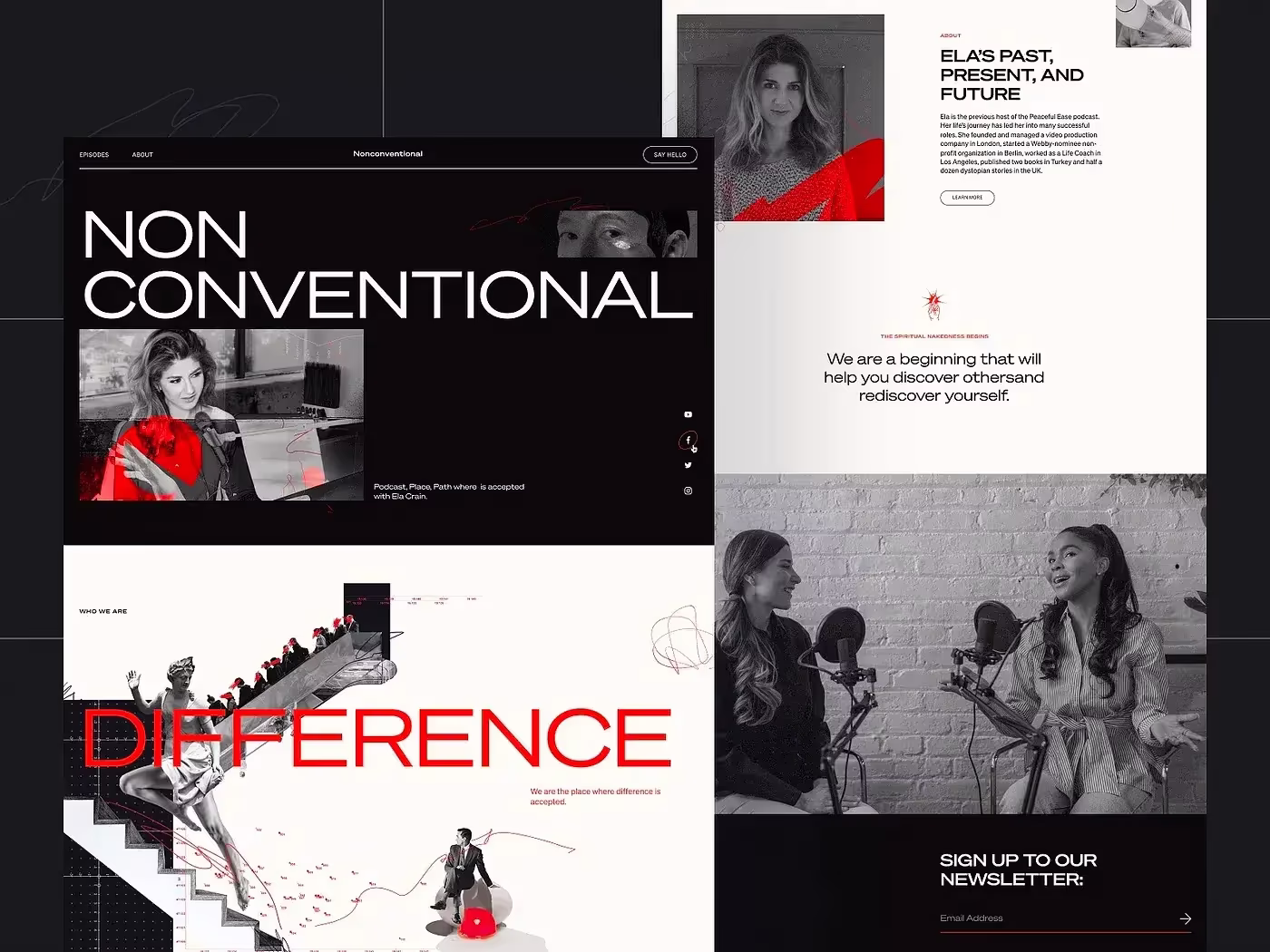 Мы обсуждали интеграцию в интерфейс модных художественных коллажей с самого начала. Среди различных типов изображений, которые могут использоваться в веб-дизайне, этот вариант определенно был самым подходящим, поскольку он раздвигал границы творчества, привлекал внимание, эффективно передавал визуальные метафоры и повышал эмоциональную привлекательность. Вот некоторые коллажи, разработанные для разных разделов сайта: