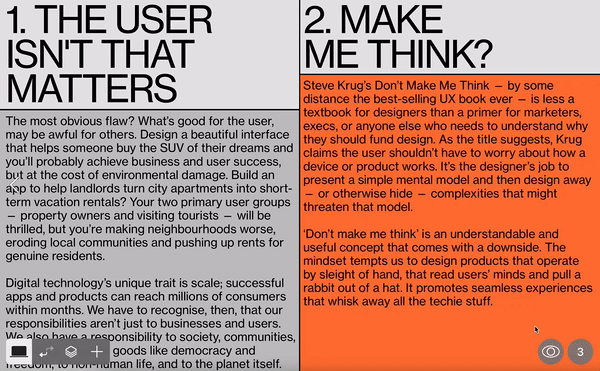В последующие годы пользовательский интерфейс Readymag изменился. Были добавлены сотни новых функций, исправлены сотни ошибок. Слабые места были переосмыслены и переработаны. Процесс усовершенствования Readymag продолжается. Сегодня его пользовательский интерфейс все еще далек от идеала; но в мире, где каждый продукт с плюс/минус похожим интерфейсом претендует на роль инструмента для решения проблем, Readymag явно выделяется.