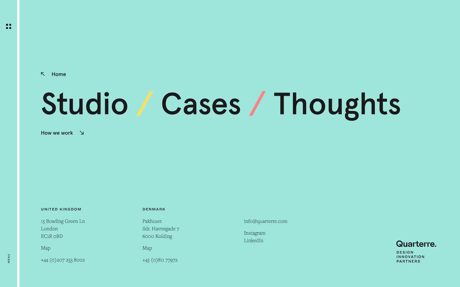 Студия Quarterre придерживается аналогичного подхода, выстраивая иерархию внутри скрытого меню при помощи масштаба и используя дополнительное пространство для размещения контактных данных, чтобы подчеркнуть наличие офисов в Великобритании и Дании.