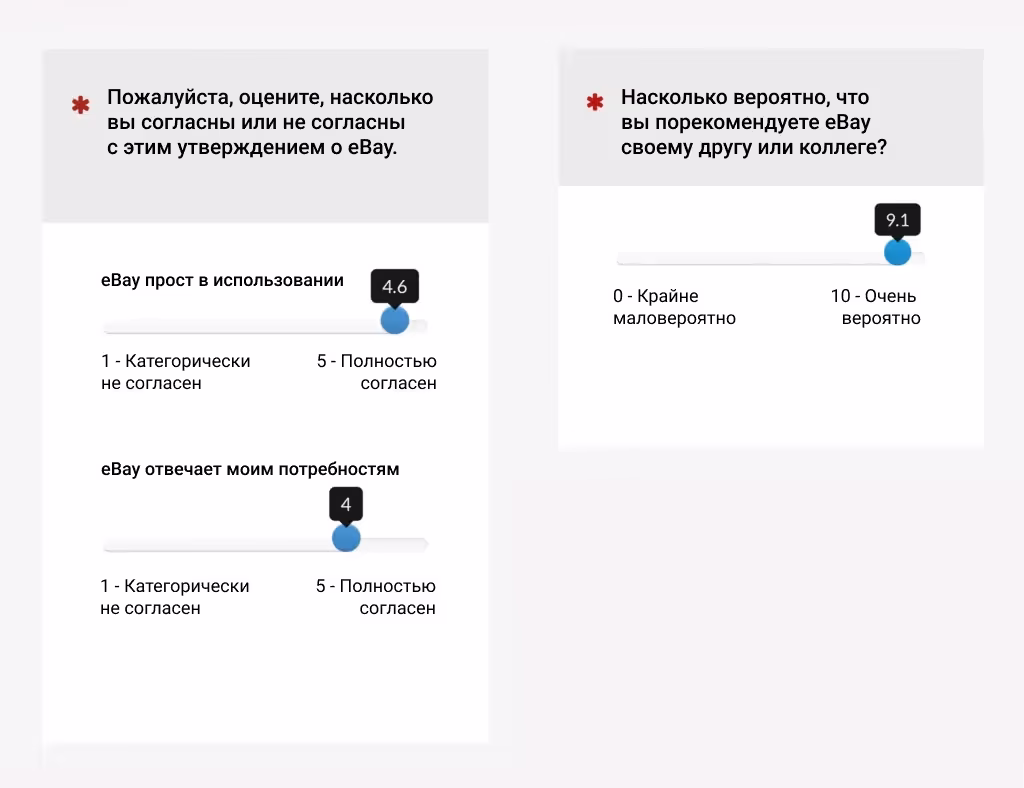 Нам почему-то кажется, что с помощью ползунков мы получим максимально точные результаты, ведь они предоставляют пользователям гораздо больше вариантов ответа и кажутся более интересными и интерактивными, чем многоточечная шкала.