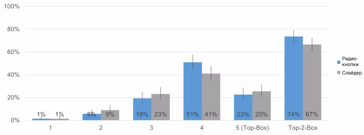 Небольшие различия не исключены: Главный вывод заключается в том, что значительных различий в поведении респондентов для числовых шкал с радиокнопками и слайдеров на компьютерах и мобильных не наблюдается. Если бы такие различия были достаточно заметными, наш эксперимент точно помог бы их обнаружить. С другой стороны, еще слишком рано утверждать, что различия, если они существуют, настолько малы, что не имеют практического значения, особенно для исследователей, которых интересуют результаты оценок по первым столбцам и первым двум столбцам.