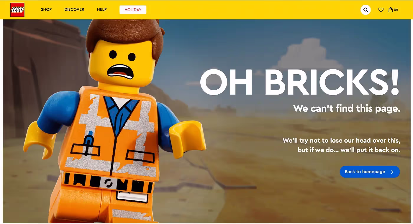 Страница ошибки LEGO с вымышленным ругательством «Oh Bricks!» и встревоженной фигуркой отражает игривый стиль бренда.