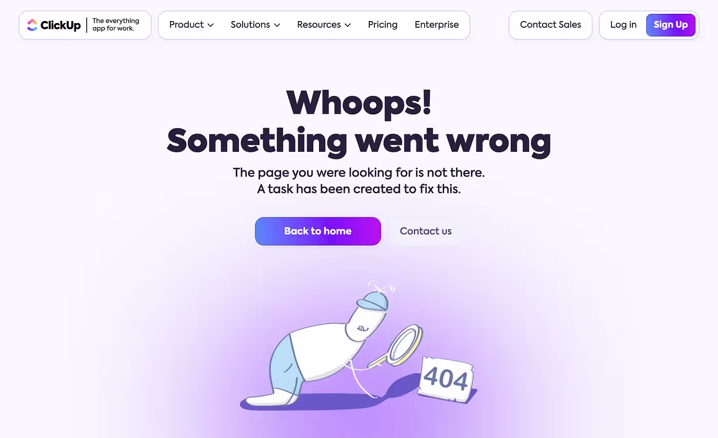 Она содержит четкое дружелюбное сообщение о том, что для решения проблемы была создана задача. Это отлично вписывается в образ бренда, ведь ClickUp — сервис для управления задачами. Игривые иллюстрации, приятные цвета и простая навигация помогают пользователям быстро вернуться к своей работе.