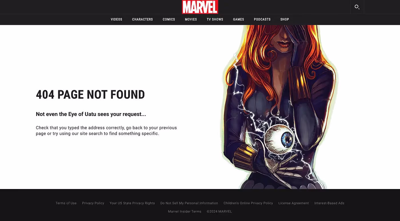 Текст и иллюстрация (Черная вдова, держащая в руках «глаз Уату») мгновенно погружают нас в волшебный мир Marvel, делая опыт более захватывающим и увлекательным. Страница дает пользователям четкие инструкции, чтобы им было легче выбраться из тупика.