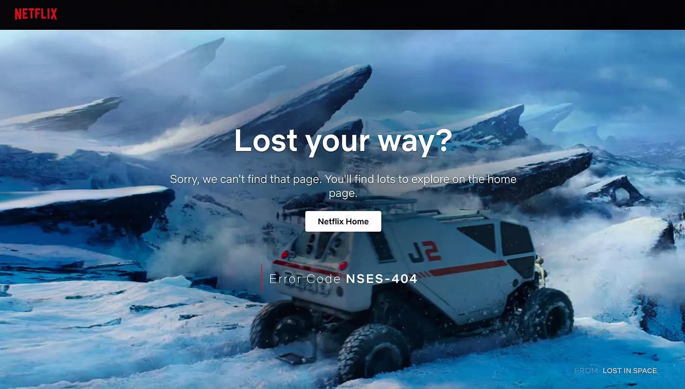 Страница 404 Netflix вписывается в единую концепцию бренда благодаря тематическому, кинематографическому подходу.