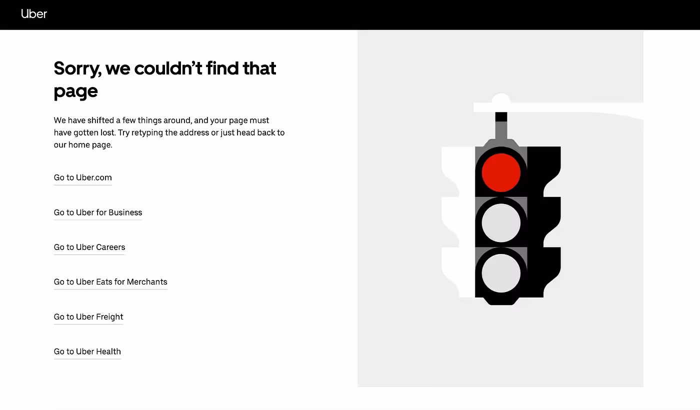 Простые понятные формулировки и профессиональный тон позволяют эффективно проинформировать пользователей о возникшей проблеме и вариантах ее решения и полностью соответствуют идентичности бренда. Светофор с красным сигналом символизирует остановку и отлично вписывается в транспортную тематику. Ссылки на основные сервисы Uber располагаются на видном месте, помогая пользователям быстро перемещаться в другие разделы сайта.