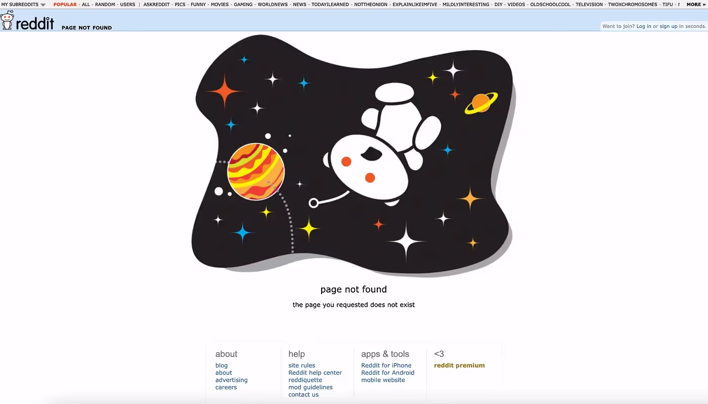 Маскот платформы, инопланетянин Сну, парящий среди звезд и планет, добавляет дизайну юмора и индивидуальности. Иллюстрация создает впечатление, что страница «затерялась в космосе» и делает опыт более увлекательным. В футере располагаются ссылки на другие разделы сайта — «О Reddit», «Помощь», «Приложения и инструменты».
