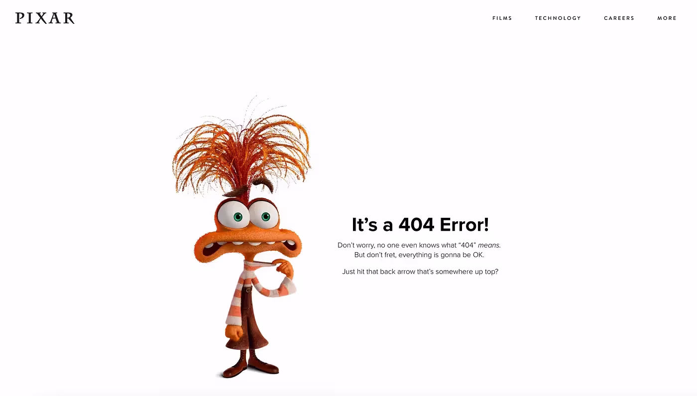 Восхитительная страница ошибки Pixar с персонажем в главной роли полностью отражает ценности бренда — веселье и простоту.