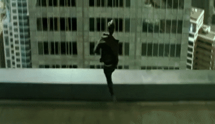 В первой «Матрице» есть сцена, где только что освобожденный Нео проходит обучение, обретает уверенность в себе и даже побеждает в спарринге своего наставника Морфеуса. Видя, что Нео готов к переходу на следующий уровень, Морфеус совершает гигантский прыжок с одной крыши на другую и приглашает Нео последовать за ним.