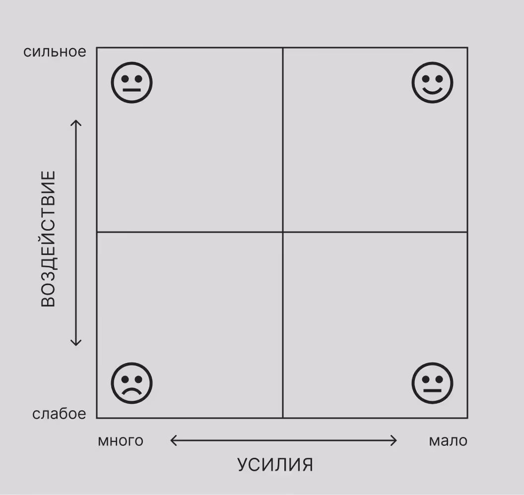 Узнав, что движет клиентами и бизнесом, мы будем лучше понимать, как нам следует распределять свое время: мы сможем расположить каждую попавшую нам в руки задачу в матрице воздействия/усилий.