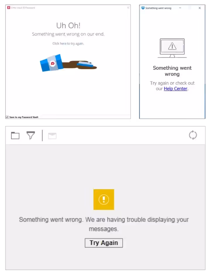Сообщения об ошибках Quicken (вверху слева), Dropbox (вверху справа), IBM Verse (внизу): ни одно из этих сообщений не описывает причин проблемы, подробностей того, как ее исправить, и не указывает, были ли потеряны данные пользователя в результате ошибки.