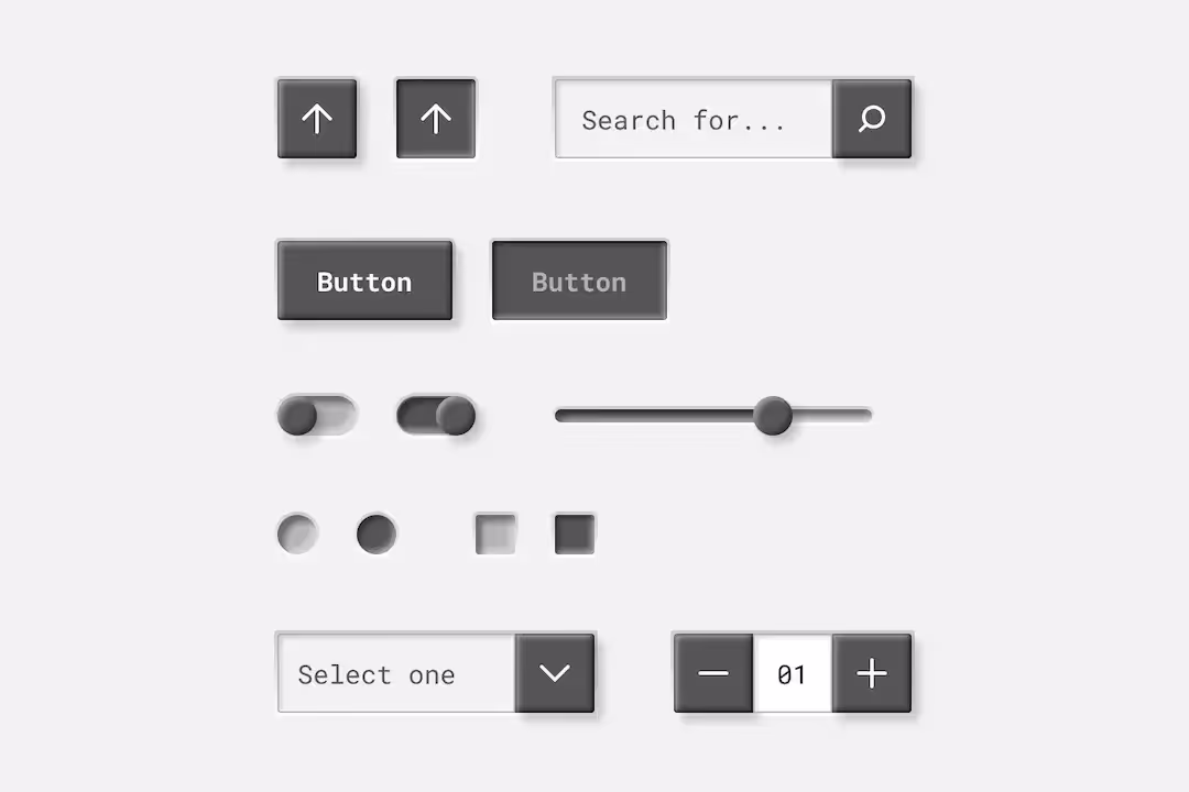Для визуализации этого стиля я использовал современные парадигмы и спецификации неоморфизма. Эти компоненты являются частью единой поверхности, образованной барельефами и горельефами (отличается от барельефа тем, что изображаемый объект может выступать из фона более чем на половину своего объёма. Также называется “высокий рельеф”). Взаимодействие представляет собой нечто среднее между двумя предыдущими стилями.