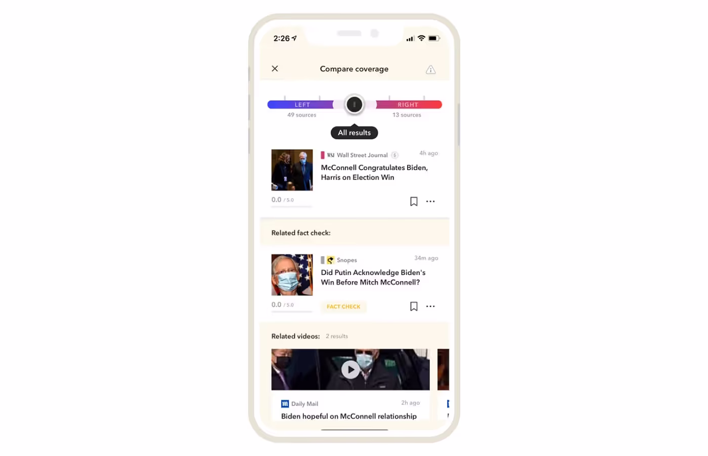 Приложение Gawq сортирует ежедневные новости по темам, избегая алгоритмов и персонализации. Во время чтения пользователь может двигать ползунок, чтобы переключаться между красной (правой) и синей (левой) точками зрения для получения сбалансированной информации и сопоставления разных источников