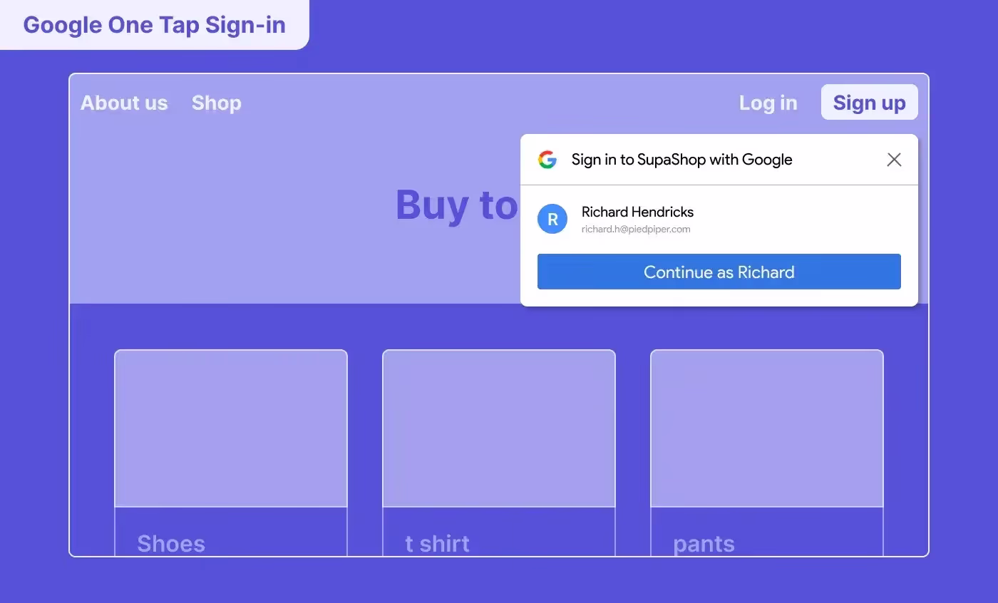 Мне очень нравится функция Google One Tap Login (автоматический вход), поскольку она значительно упрощает возвращение на сайт. Если пользователь вошел в свой Google-аккаунт и покинул сайт / приложение, а потом вернулся, на экране появится небольшое окошко с вопросом, хочет ли он войти в систему. Пользователю даже не придется нажимать на кнопку входа.