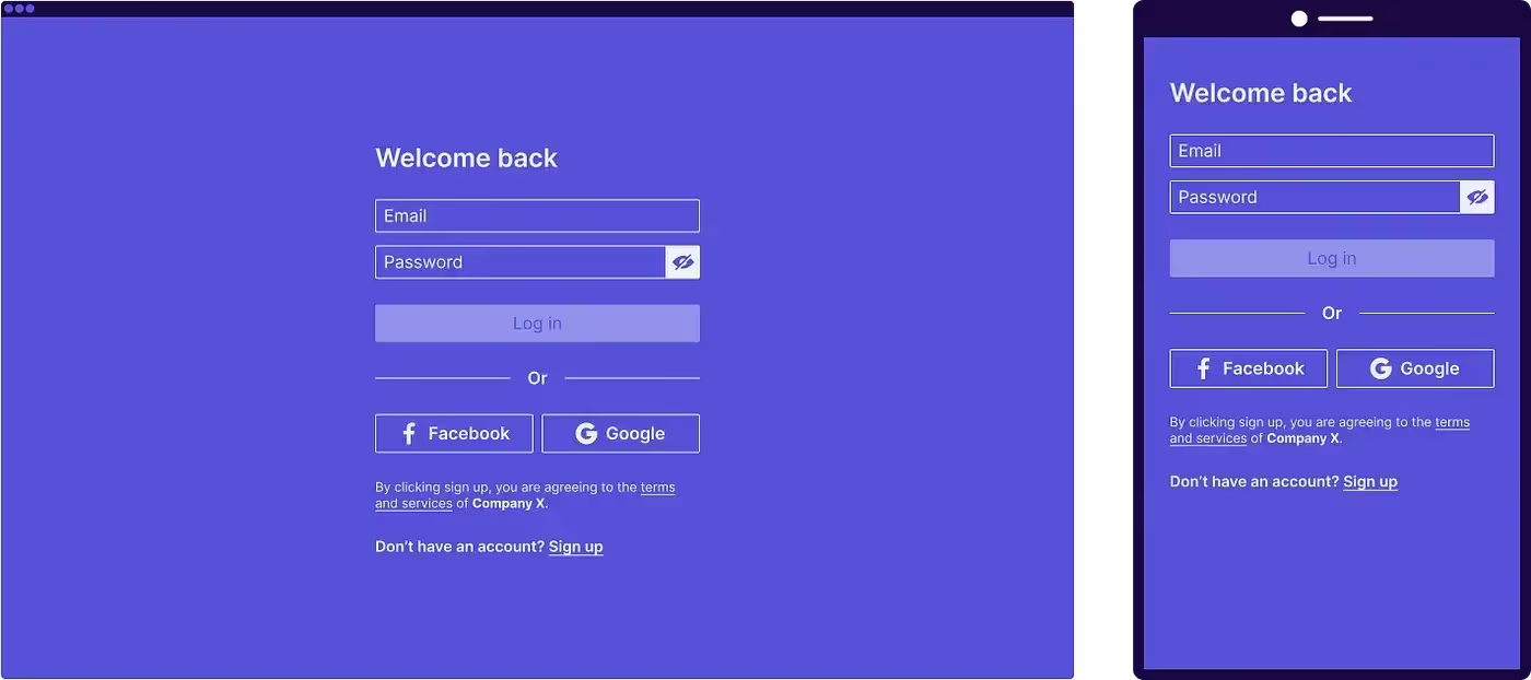 Гибридный шаблон содержит как опции SSO, так и возможность входа с помощью электронной почты. Одним из его недостатков заключается в том, что он может выглядеть довольно перегруженным, если на экране слишком много элементов.