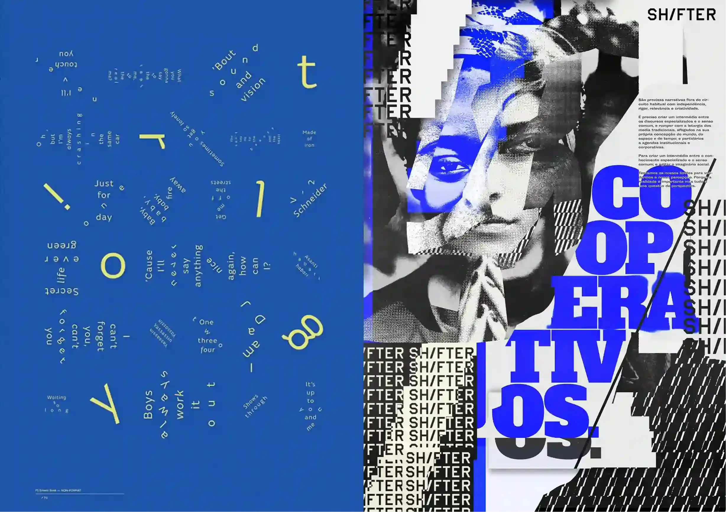 Вместо аккуратной модульной сетки — хаос: элементы сдвинуты, выравнивание «плавает», композиция выглядит неустойчивой. Но именно в этом хаосе рождается динамика. Например, постеры Берлинской школы дизайна часто строились на «сломанных» сетках, где заголовки и изображения будто спорят друг с другом за внимание.