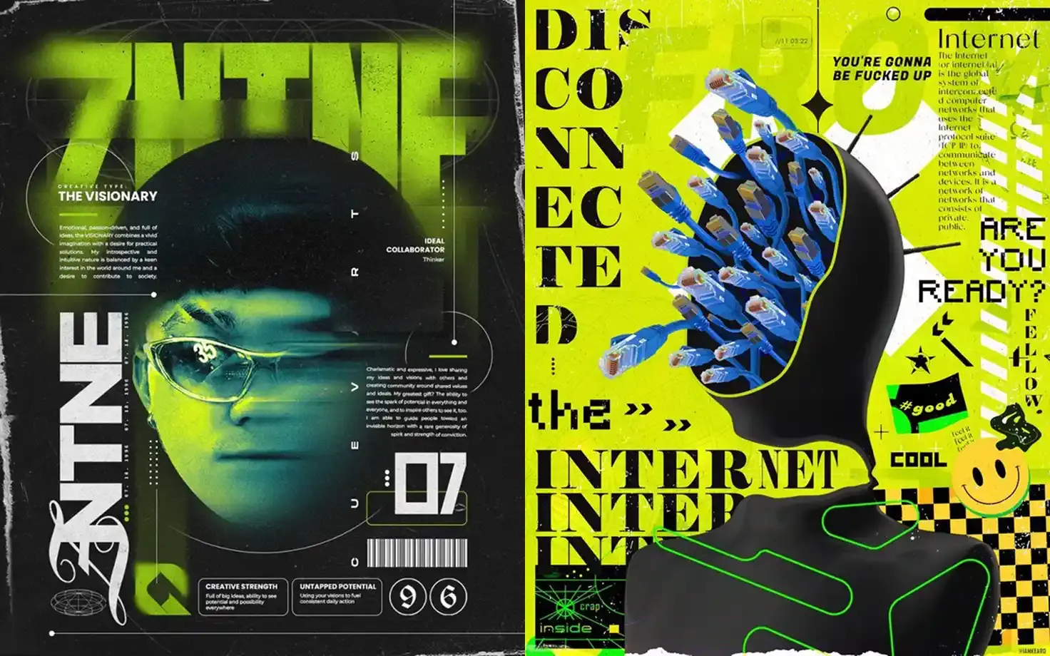 Антидизайн — это спецэффект, который работает там, где важна эмоция, драйв и неожиданность. Он отлично подходит для постеров арт-ивентов и музыкальных вечеринок, DIY-зинов, обложек альбомов, а также для сторис и постов в соцсетях, где нужно мгновенно зацепить взгляд аудитории. В таких проектах дерзкая типографика, кривой кернинг, кислотные цвета или «глитч»-эффекты создают уникальное настроение и делают контент запоминающимся.