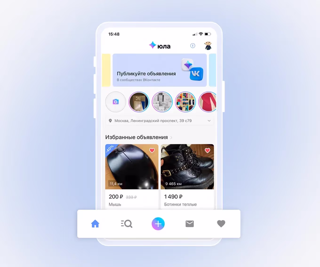 Нижняя панель позволяет быстро переключаться между разделами приложения. Здесь собраны все ключевые действия: «на главный экран», поиск, новое объявление, сообщения и сохраненные объявления.