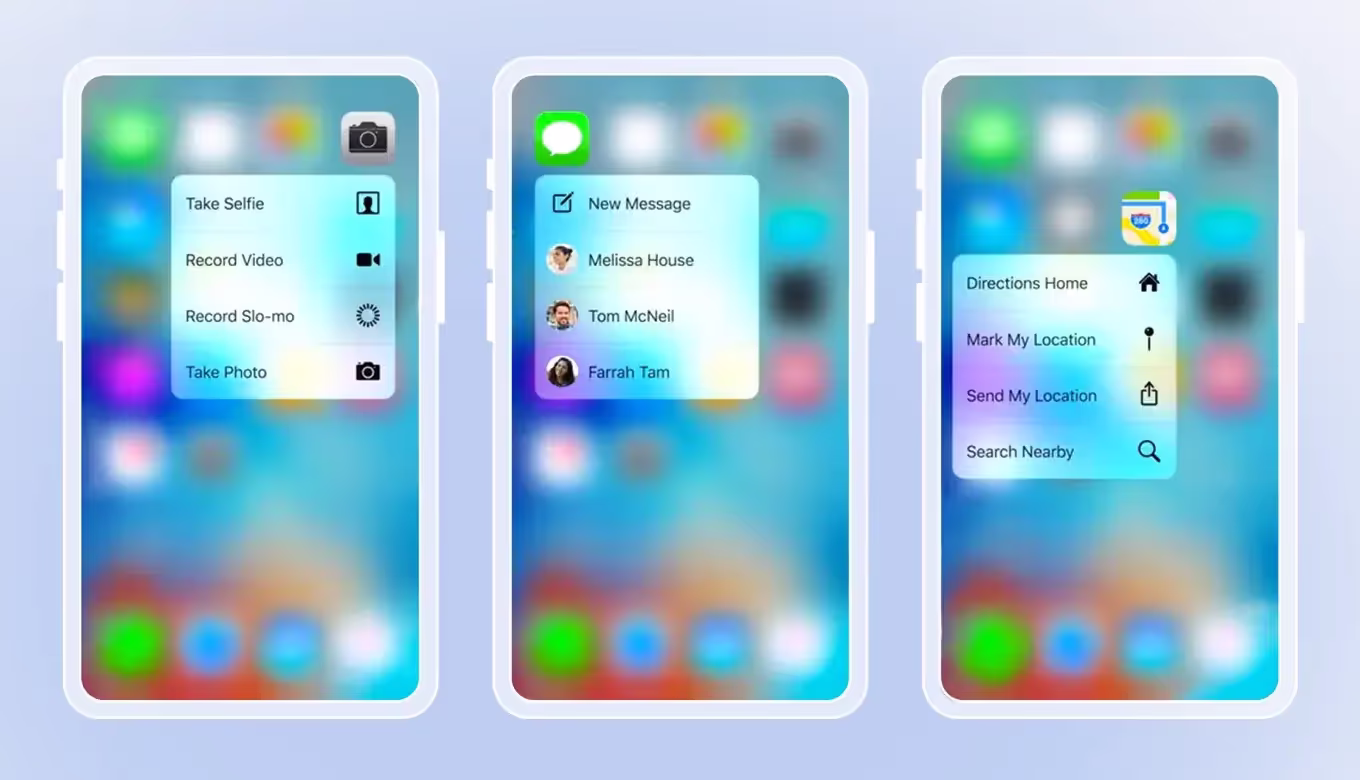 Впервые такое решение предложила своим пользователям компания Apple. 3D Touch это навигационная иконка, которая показывает ключевые действия для выбранного приложения с домашнего экрана. При долгом нажатии на иконку приложения появляется короткий список быстрых действий.