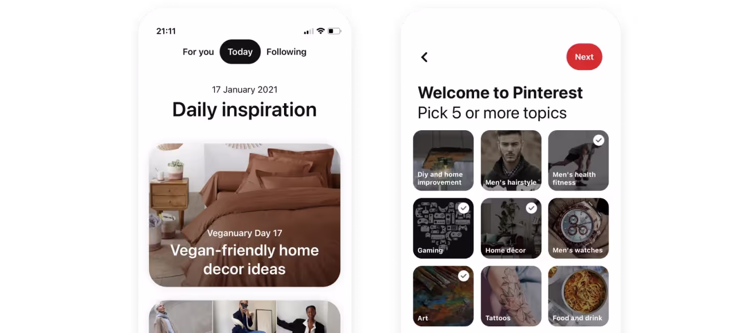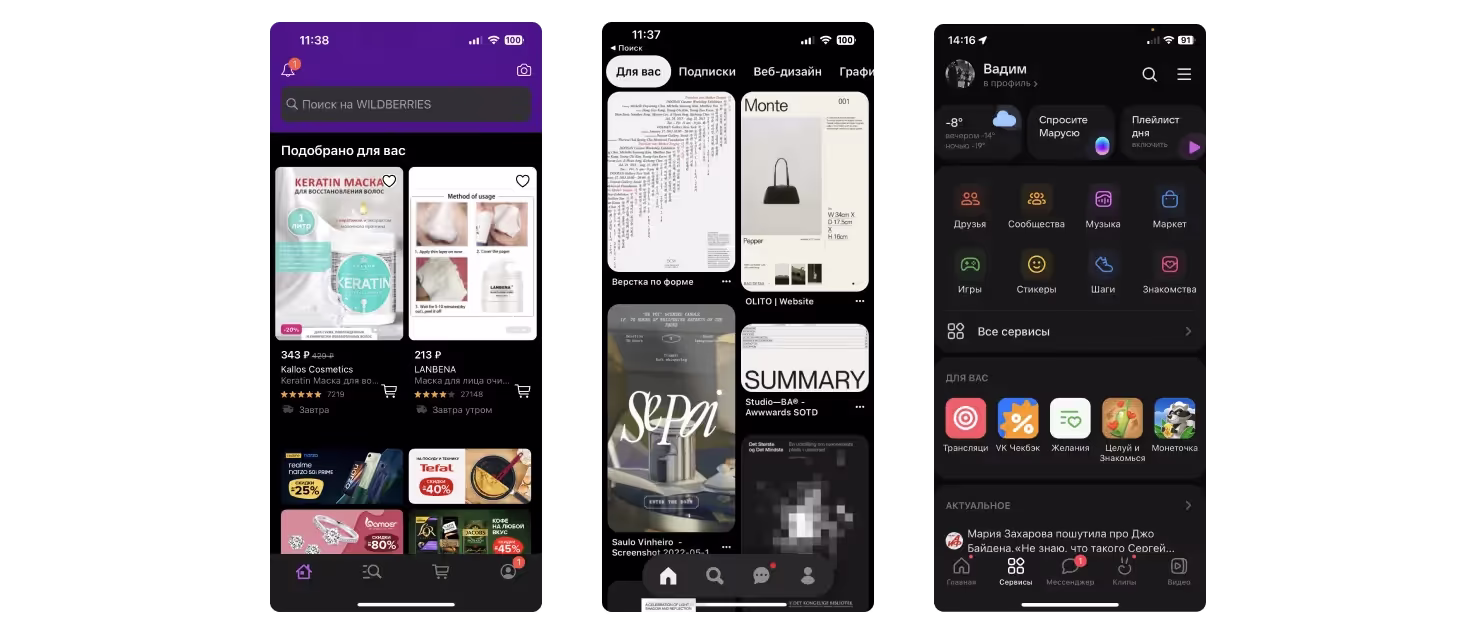 Рассмотрим на примере приложений Pinterest, Wildberries, ВКонтакте: