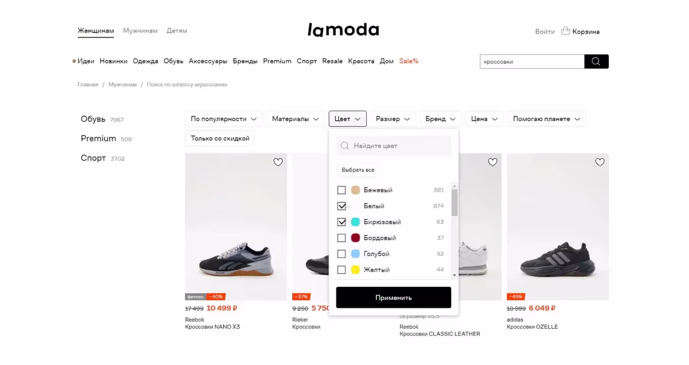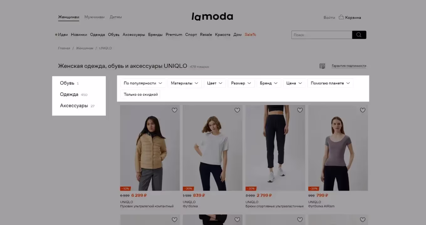 Не все страницы и товары можно отсортировать по заданному набору признаков. Помимо общих атрибутов, например, бренд, размер, цвет и цена, каждая категория может иметь дополнительные фильтры, характерные именно для нее.