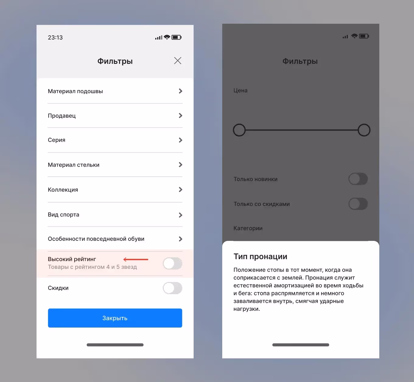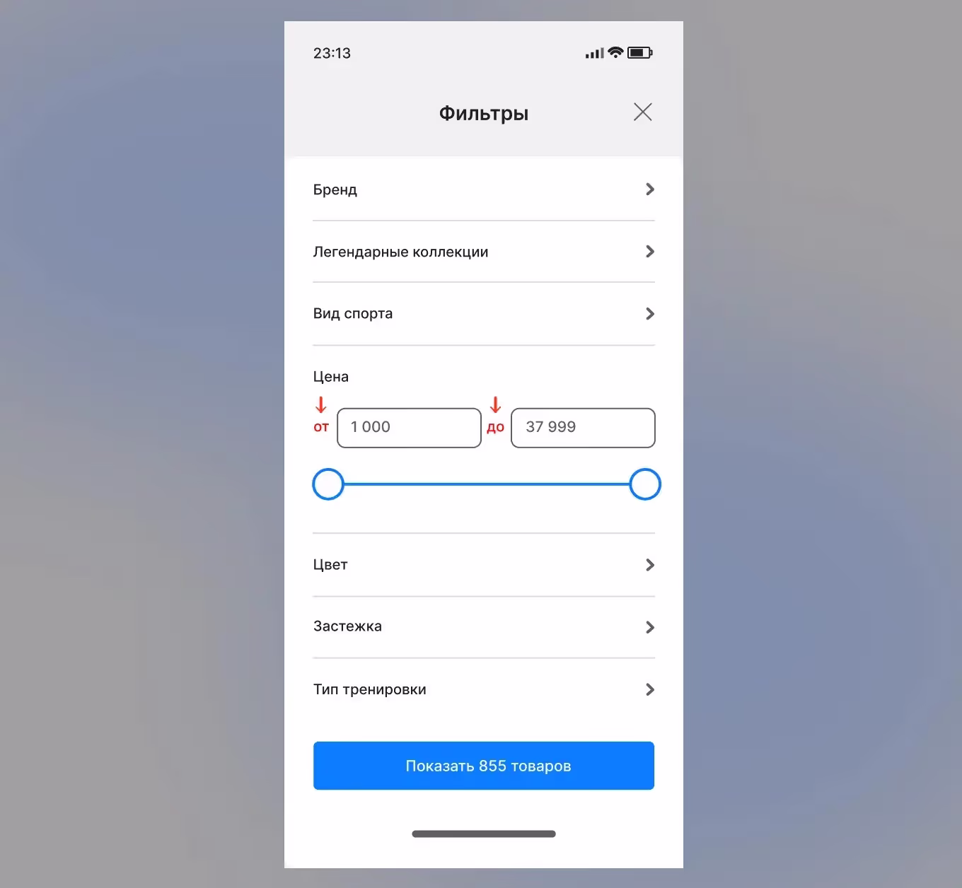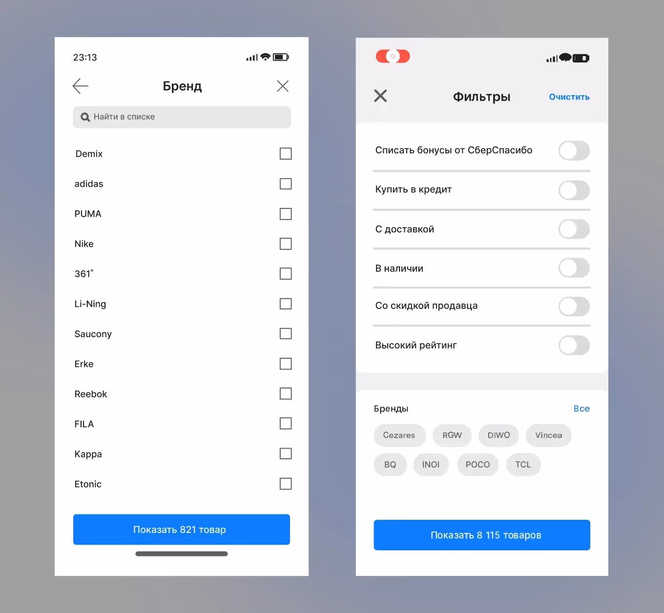 Интерфейс фильтров часто выполняется в формате карточки, но встречаются и полноэкранные форматы.