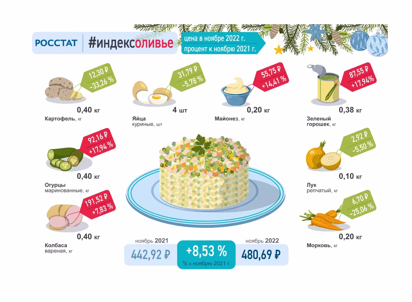 Сравнительная инфографика на сайте Росстата, которая позволяет сравнить цены на салат оливье в 2021 и 2022 году: