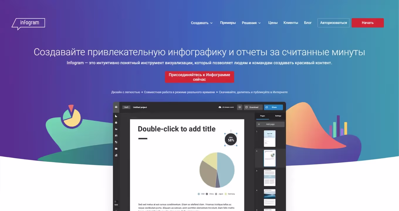 Сервис с большим количеством гибких настроек позволит создавать красочную инфографику с использованием диаграмм, графиков, таблиц и иллюстраций.