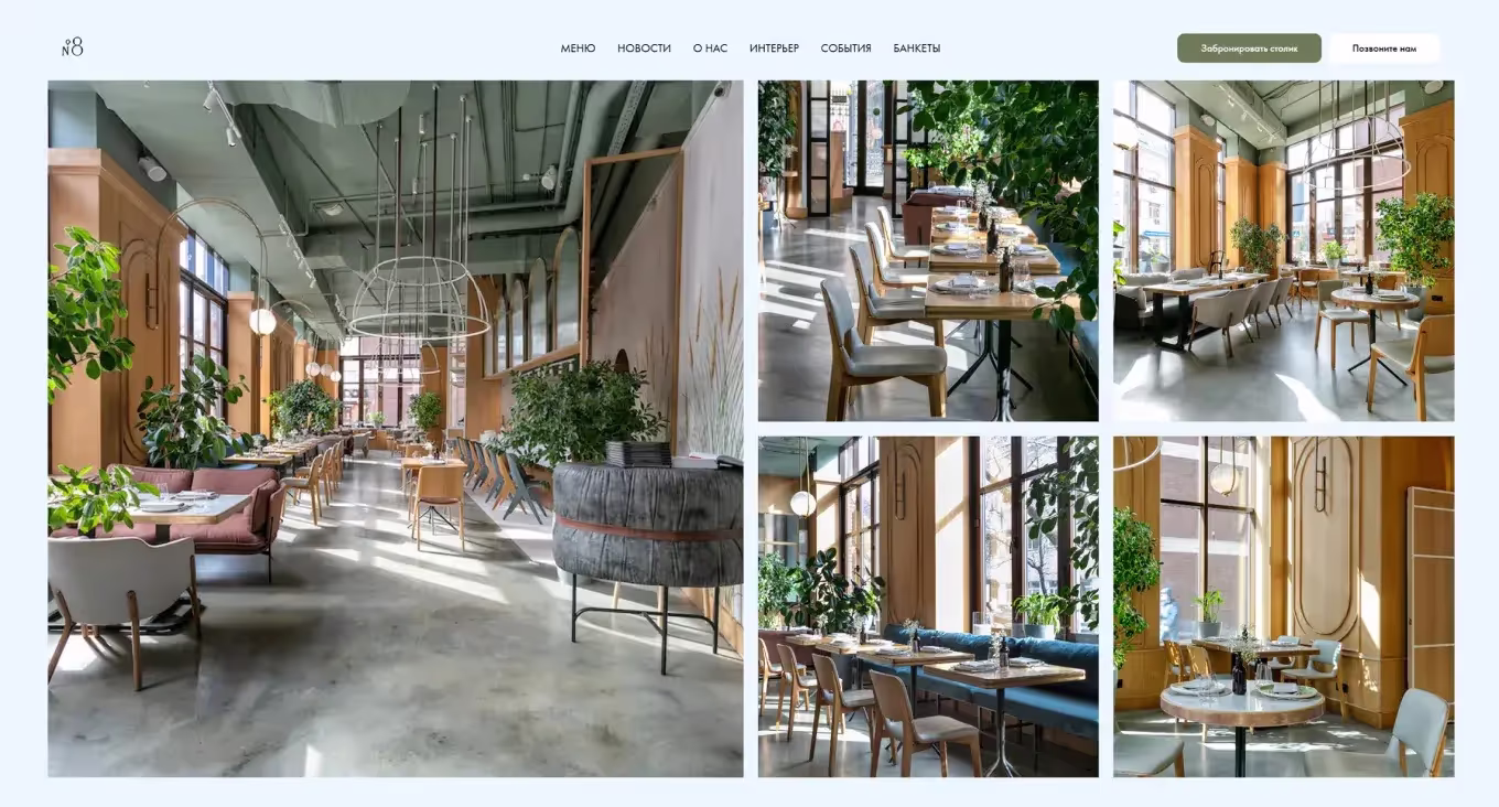 Например, на фотографиях интерьера ресторана «Дом №8» можно выделить обилие растений, мягкие и теплые цвета, много света и воздуха. Благодаря декоративным элементам, имитирующим пилястры, возникает связь с итальянской архитектурой. Ресторан находится на ул. Малая Пироговская, 8, почти в самом центре Москвы. Эту информацию автор преобразовал в следующий текст, помещенный на главной странице сайта: